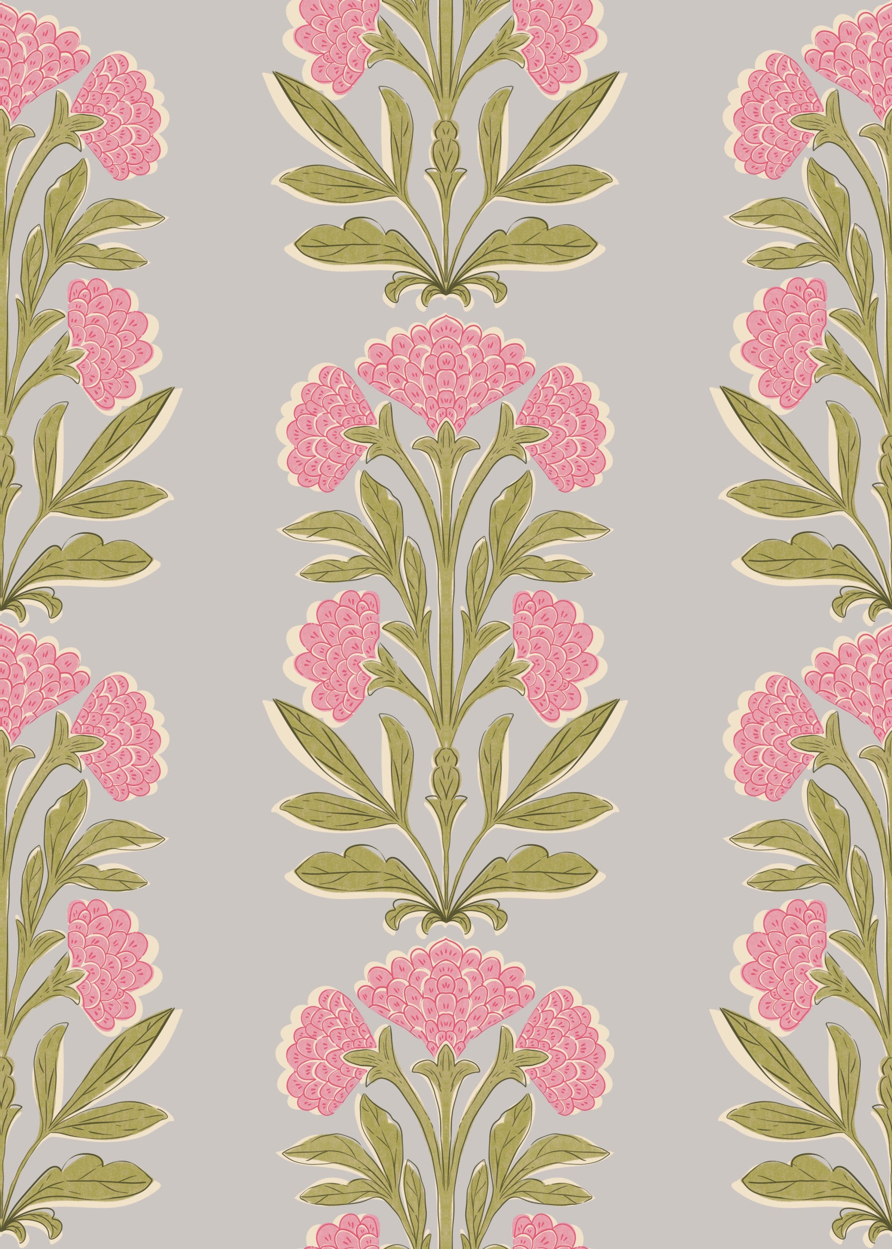 Infuse your home with the grace of nature using this floral wallpaper for walls. It features a symmetric pattern of pink blooms and green foliage against a soft grey backdrop. The design offers a retro aesthetic with a modern twist. Its gentle hues and balanced composition work great in any room, especially bedrooms, living rooms, and dining areas. It is perfect for creating a calm and inviting atmosphere.
