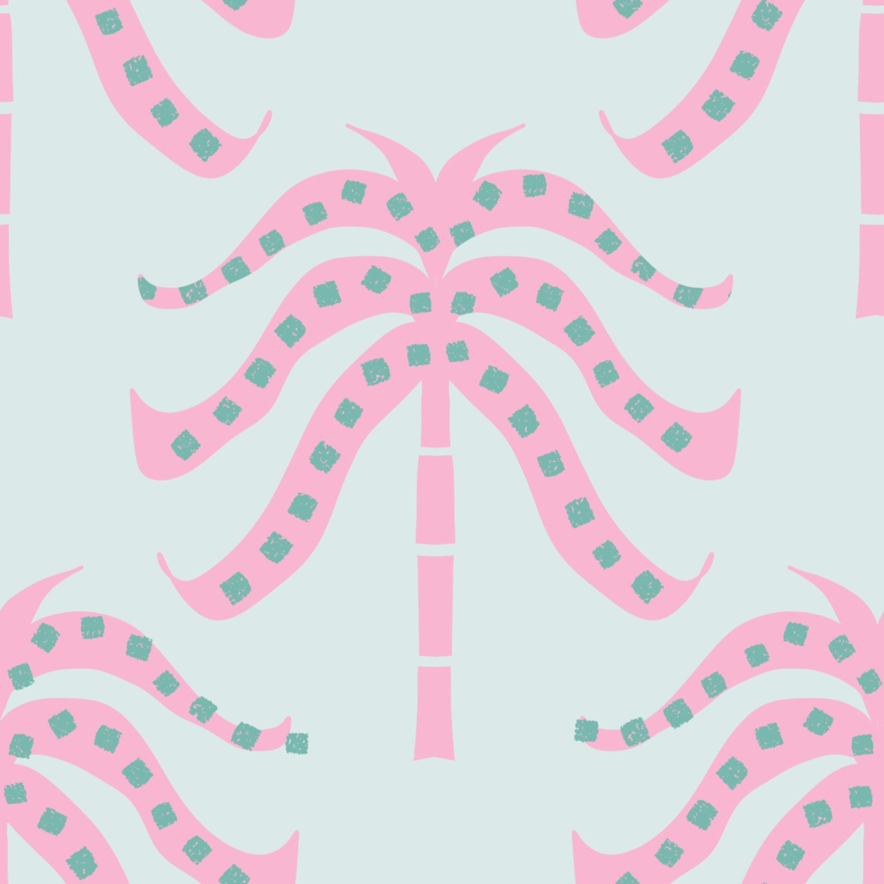 Transform your space with this whimsical palm tree wallpaper. Soft pink palms, dotted with teal, stand out against a light mint background. This wallpaper for walls instantly adds a playful element. Ideal for kids' rooms, nurseries, or bathrooms, the pattern brings an easy charm to interiors. The pastel hues and simple design complement a range of décor styles, creating a bright and joyful atmosphere.