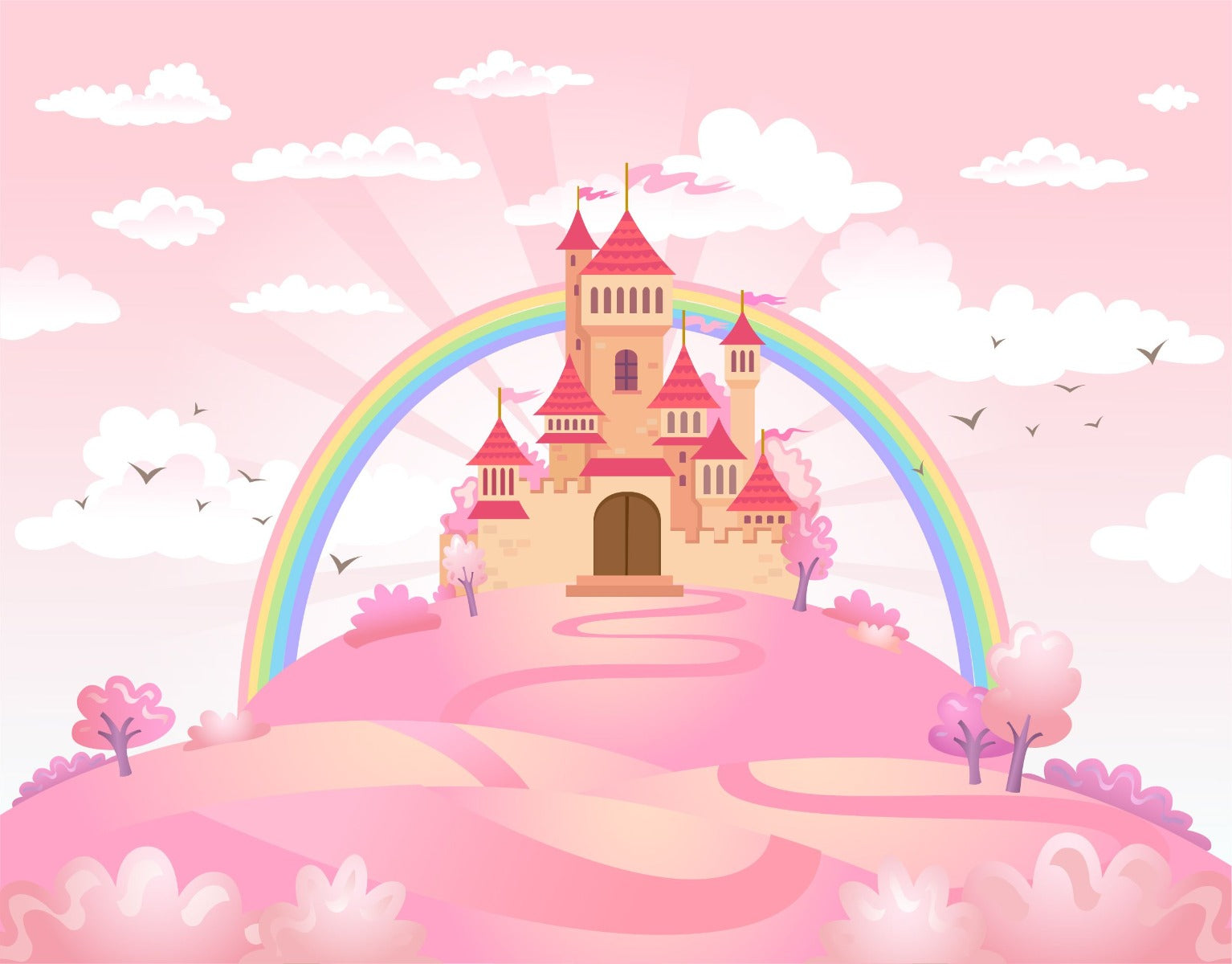 Pink Castle Girls Wallpaper with soft clouds and rainbows.