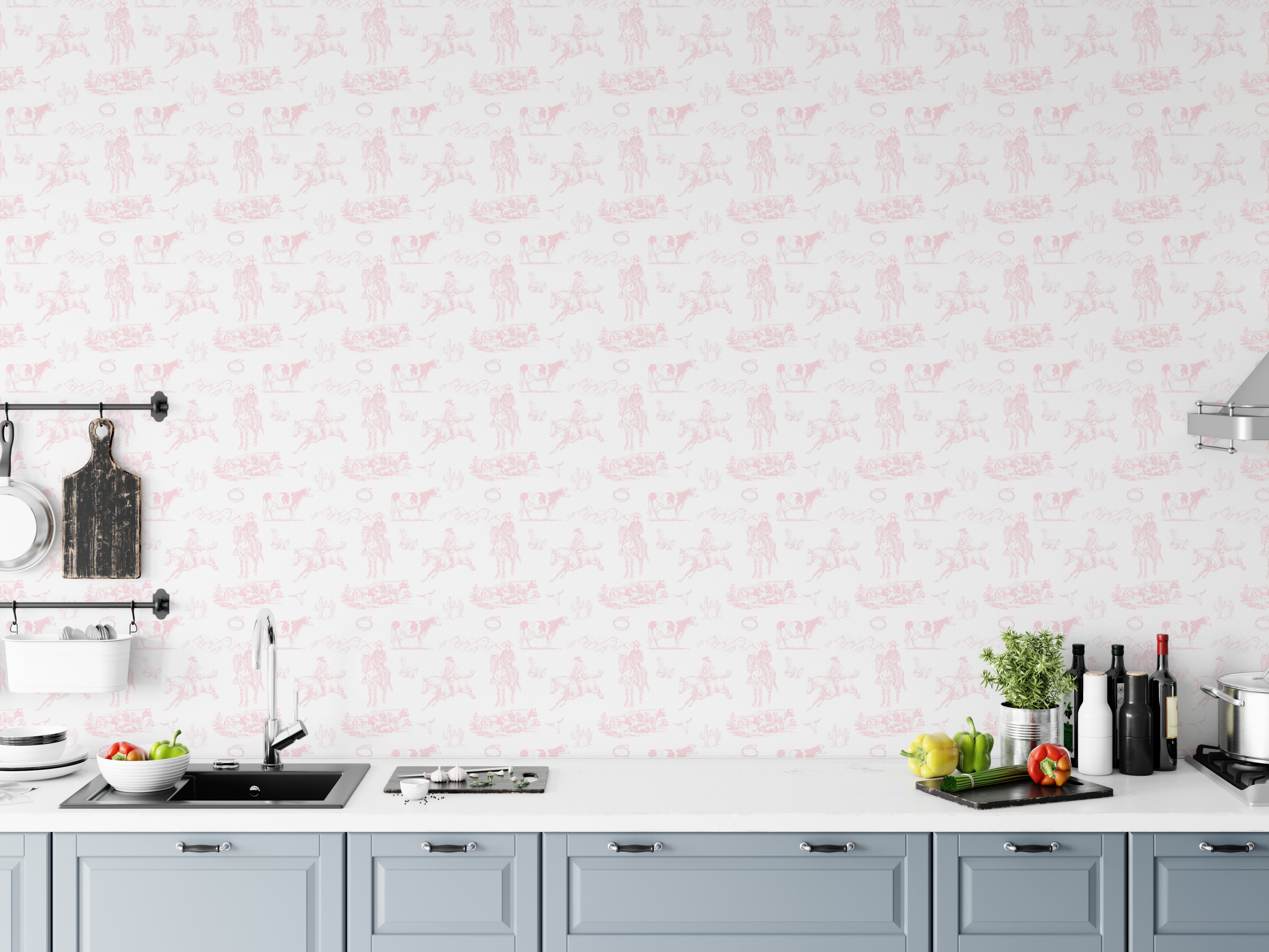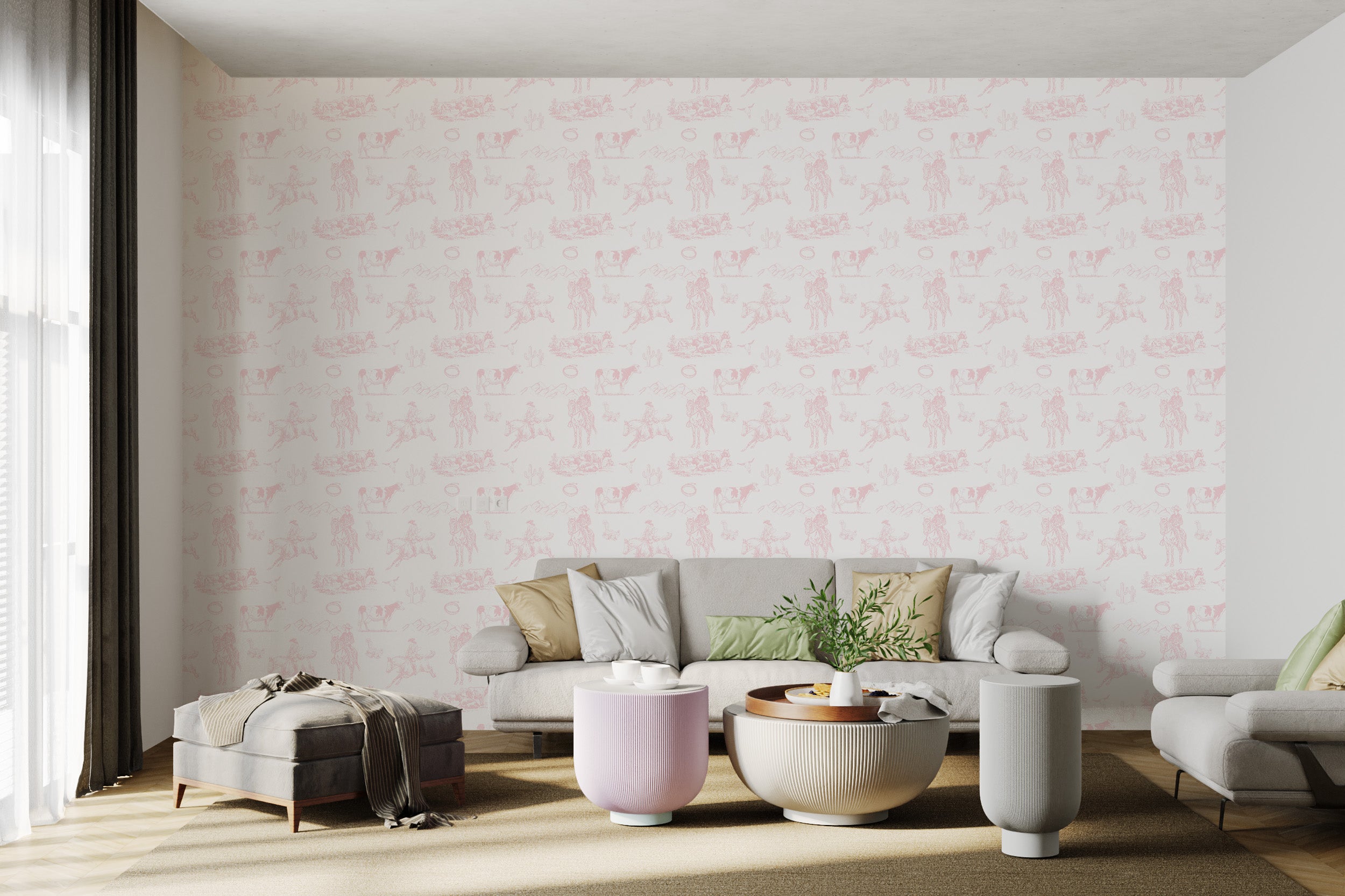 Wild West-Inspired Pink Wallpaper with Classic Toile Design