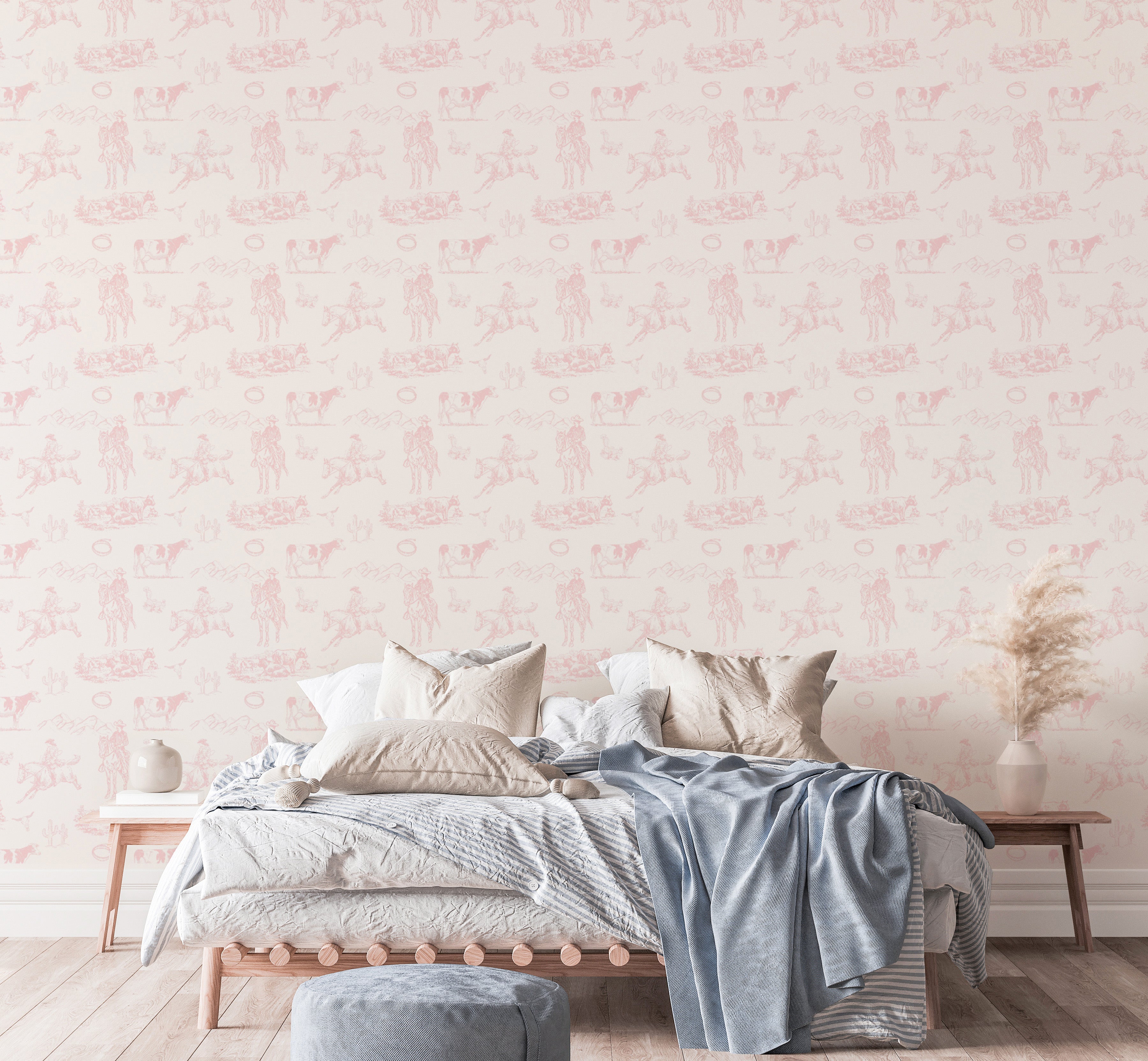 Farmhouse Aesthetic Western Toile Wallpaper in Pastel Pink