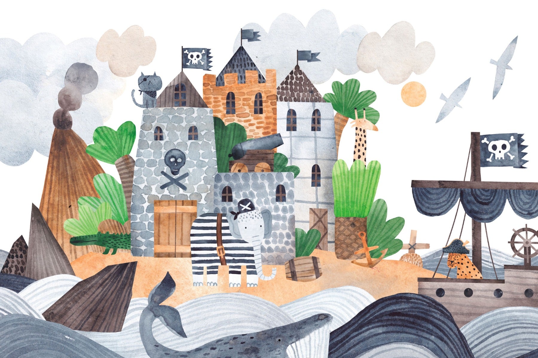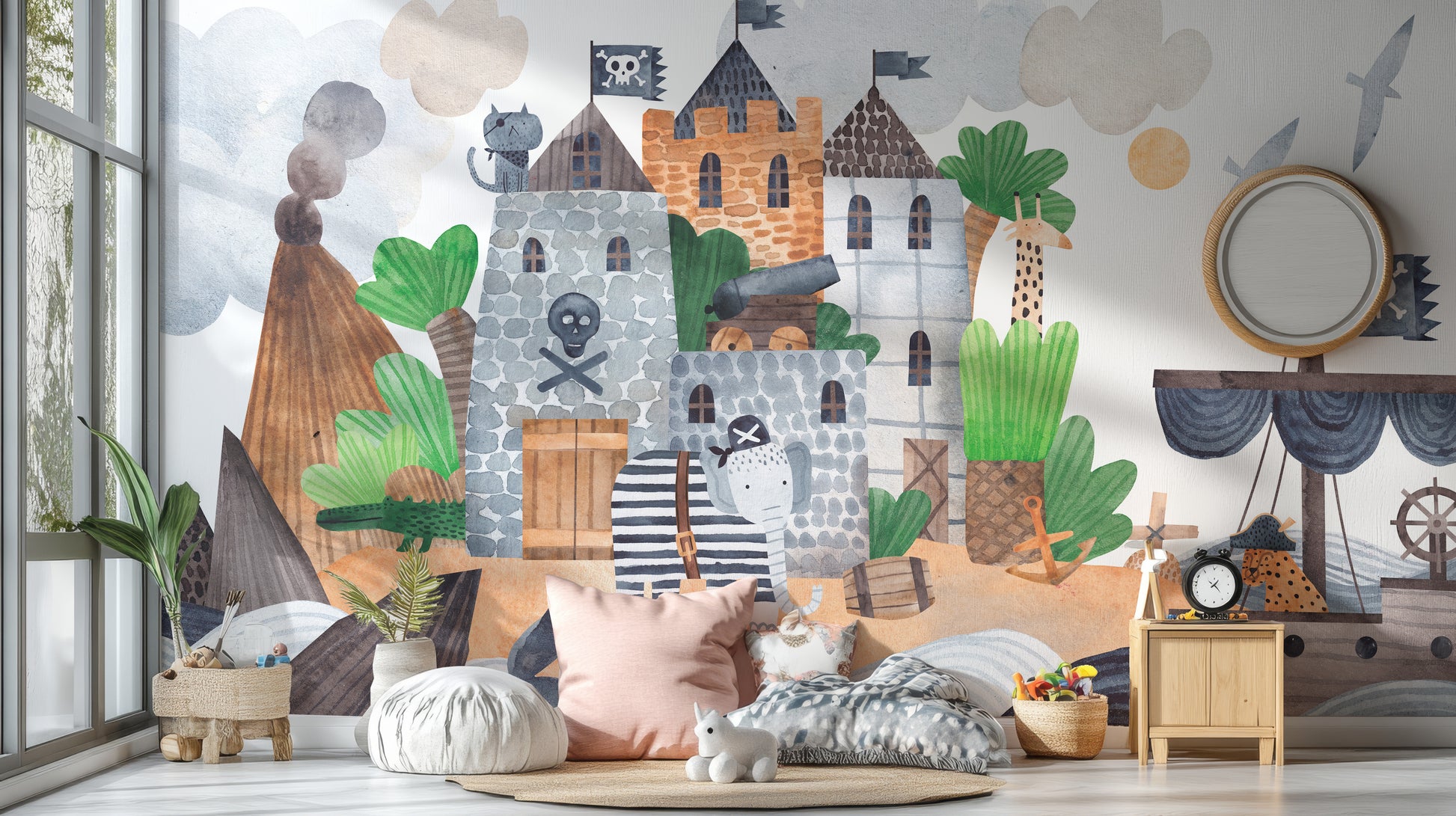 Bring the thrill of pirate adventures into your child's room or play area with our pirate fortress wall mural. Designed to inspire and ignite the imagination, this mural features a detailed and realistic pirate fortress, complete with towers and flags, making it a perfect backdrop for playtime stories and adventures.