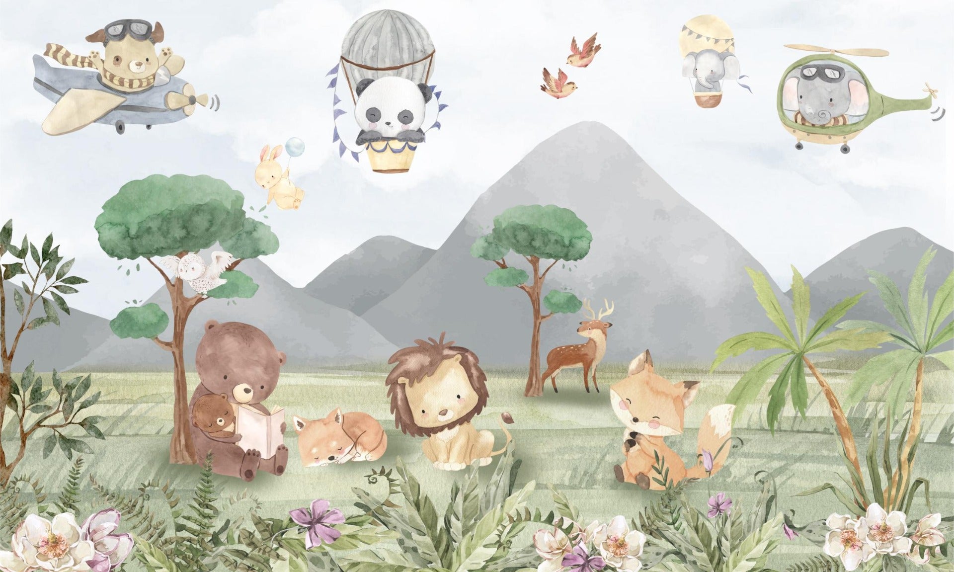 Brighten up the little one's bedroom with our kids room wallpaper. This charming forest animal mural bursts with cheerful woodland creatures, engaging kids' imaginations. Delight in the vivid detail as a bear reads, a panda floats, and other animals frolic. Perfect for creating a nurturing environment, this wallpaper invites playful learning and sweet dreams.