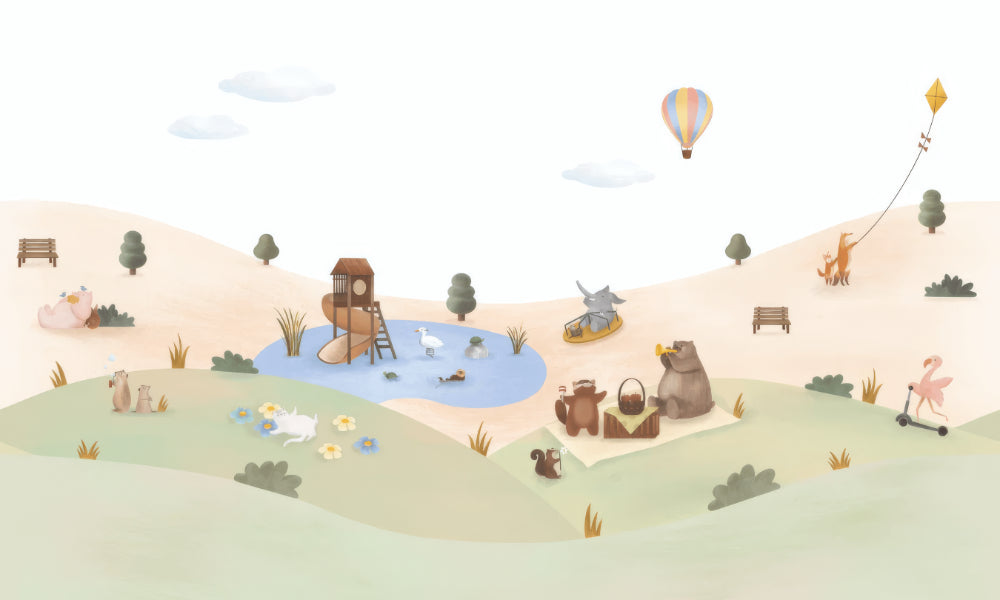 Delight little ones with the playful animals garden wall mural a vibrant scene that enlivens a kids nursery wallpaper mural. Each detail, from frolicsome creatures to serene landscapes, is crafted to inspire stories and dreams. A pond's ripple, a tree's whisper—every element harmonizes to foster a world of wonder for young minds. This piece infuses playtime with creativity, turning nurseries into havens of adventure.