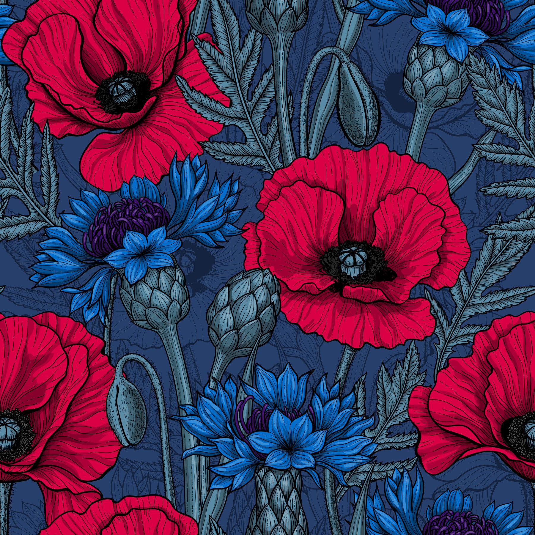 Vibrant floral wallpaper featuring poppies and cornflowers