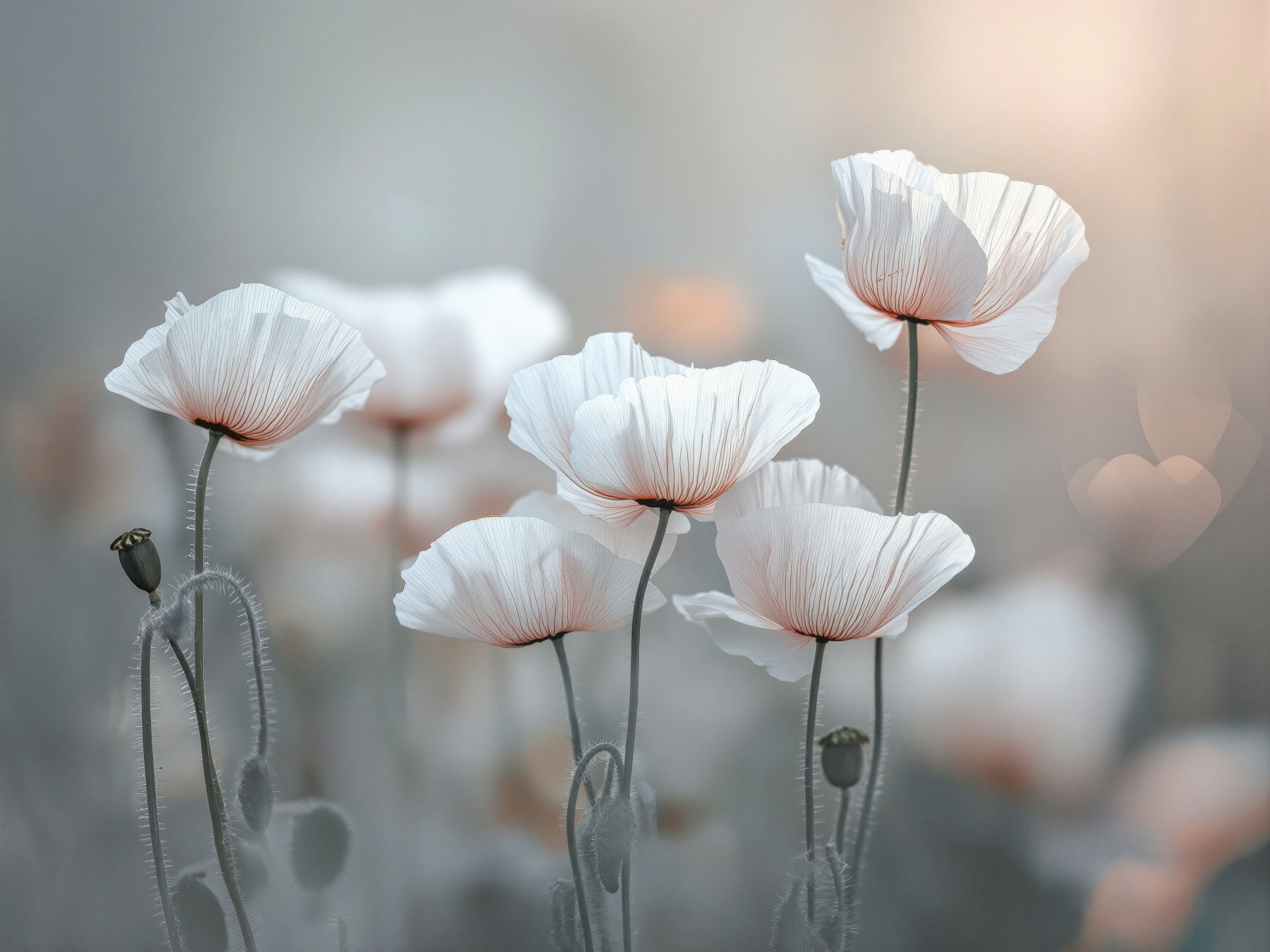 Poppies flowers. Embrace tranquility with this stunning poppy field wallpaper. The delicate white petals contrasted against a gentle peach glow bring a sense of calm. The design captures a dreamy landscape, suited for creating peaceful environments. Ideal for bedrooms, living rooms, or studies, this wallpaper for walls will introduce a serene beauty. It softens modern interiors and adds a whimsical touch to minimalist designs. Infuse your space with this subtle floral elegance today. It will make you feel dreamy and light.