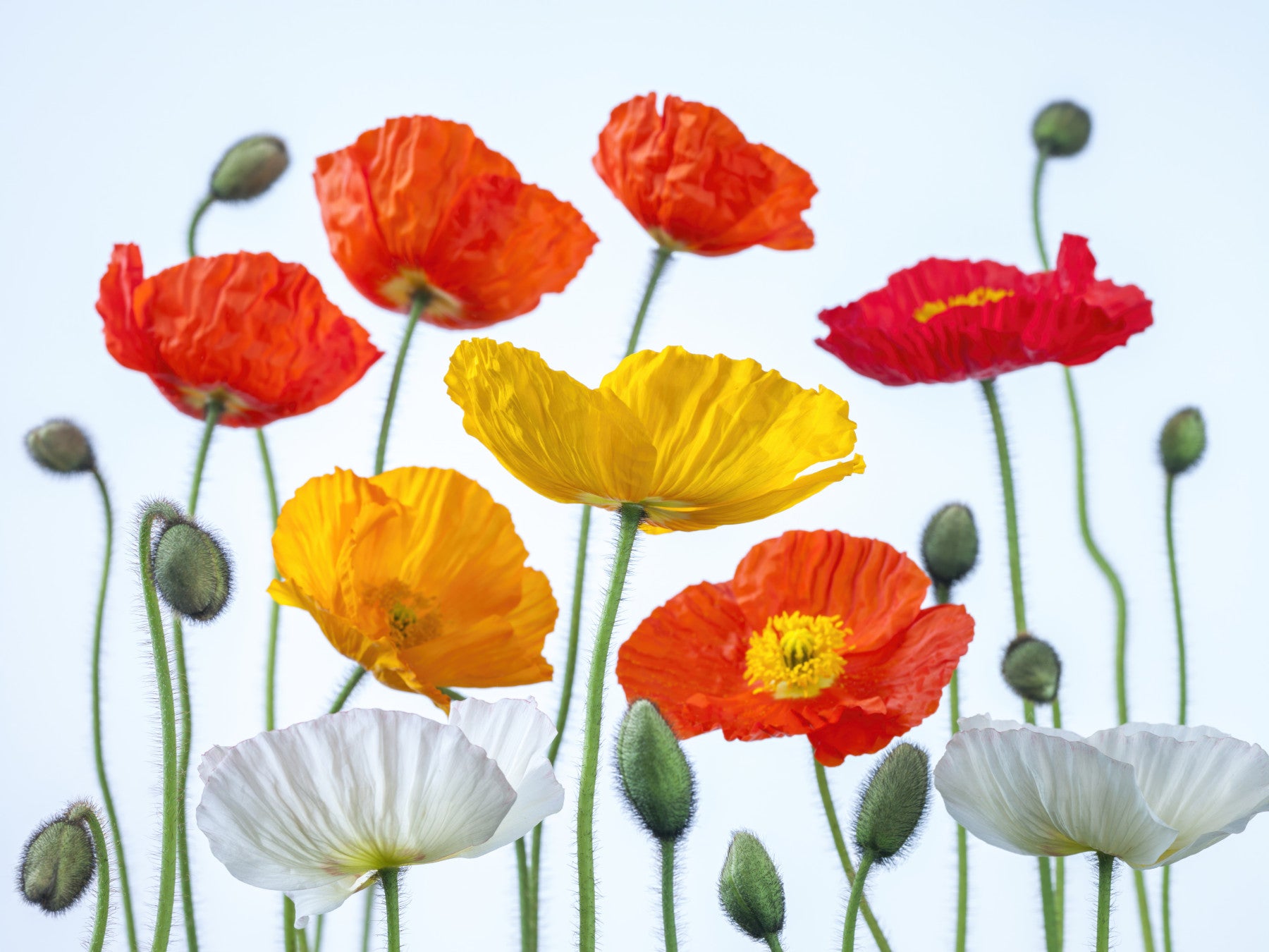 Multi coloured Poppies and buds. Bring the vibrancy of a blooming poppy field into your home with this stunning wallpaper for walls. The design showcases a collection of poppy flowers in various stages of bloom. From tightly closed buds to fully open petals, their cheerful disposition comes to life with vivid reds, oranges, yellows and pristine whites. The crisp, clean background allows the colours to pop, creating an uplifting and energetic ambiance. Consider this bold floral print for your living room, dining room or hallway to add a touch of nature’s beauty and create an inviting atmosphere.