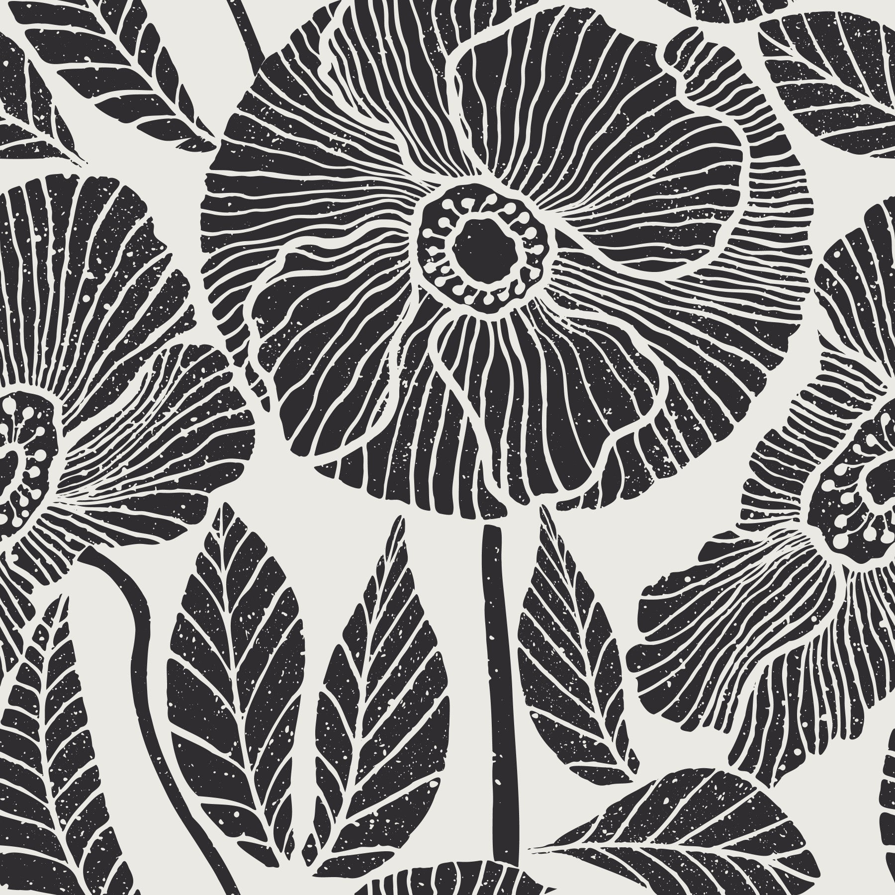 Poppy Floral Modern Block print wallpaper, textured black and white botanical design.