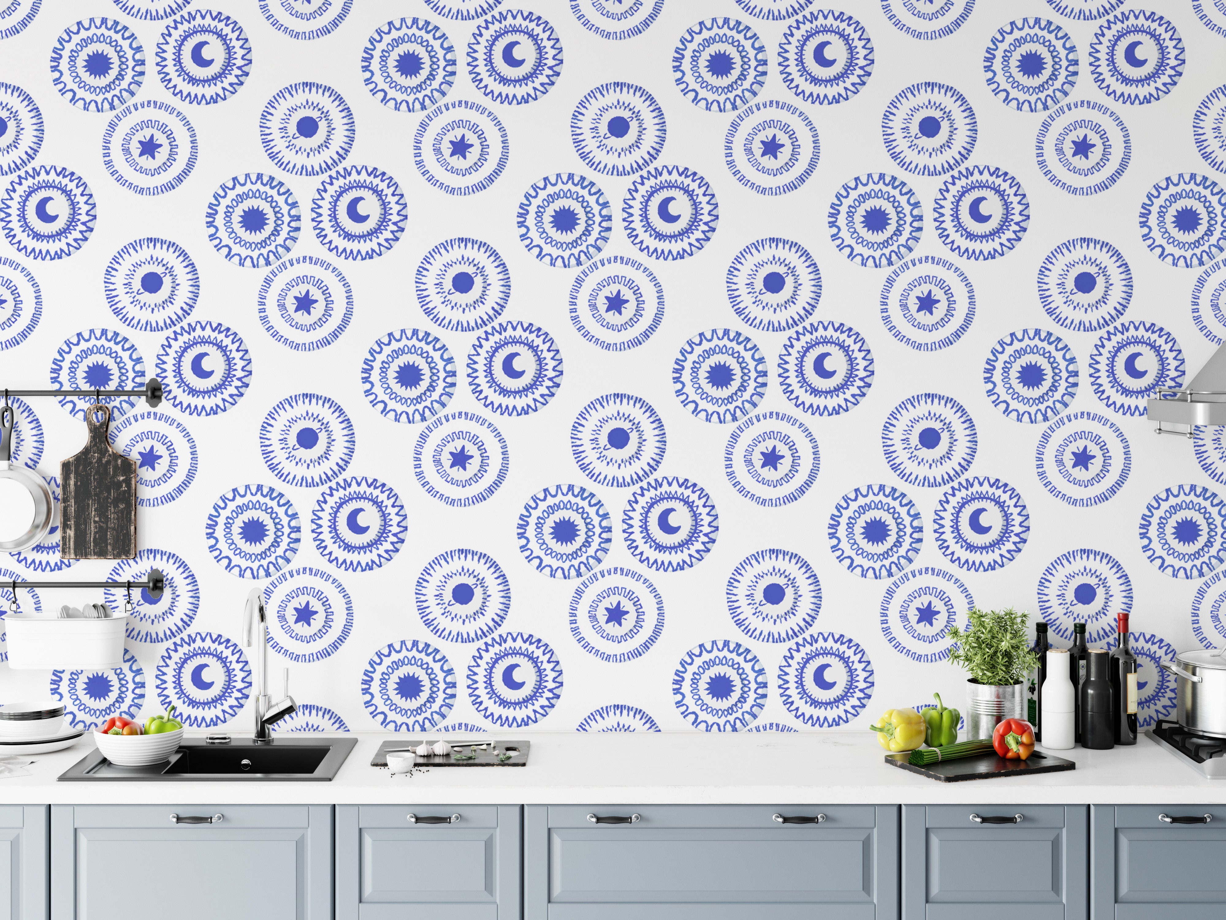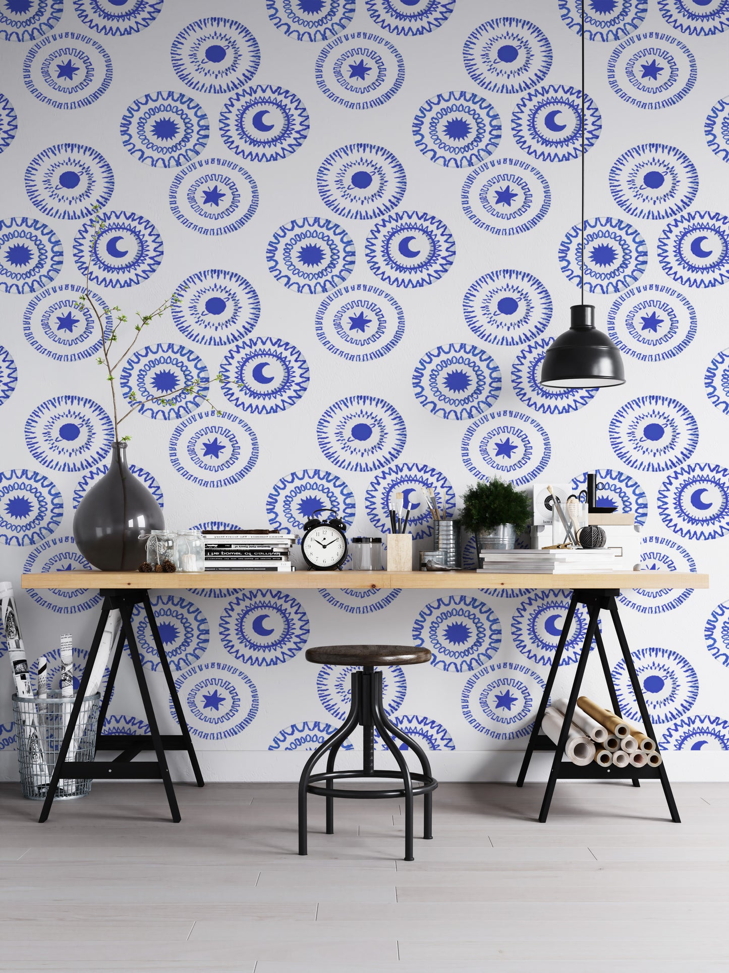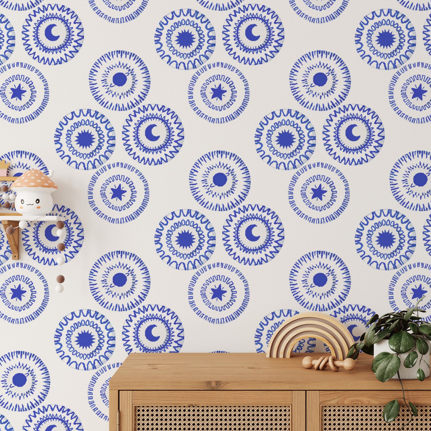 Made in an eye-catching porcelain blue colour, this removable wallpaperis meant to create a timeless and classic statement look throughout your interiors. This pattern, which contains the sun, moon, and stars, makes this wallpaper appear alluring as well. The deep blue hue creates a rich and warm ambiance, making the colour perfect for different rooms of your house. Perfect for refreshing a bedroom, living room, or study, this is a stylish removable wallpaper solution. It applies and removes easily so your walls stay in great condition. Available for order now with free delivery on this beautiful wallpaper.