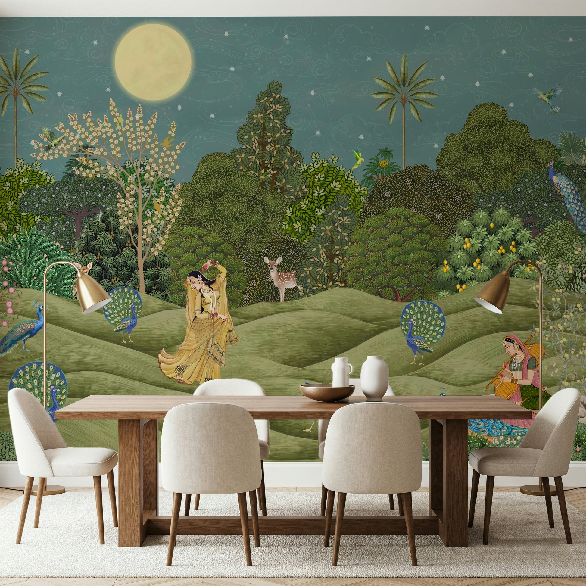 Step into the enchanting world of "Purnima Paradise," a wall décor piece that captures the ethereal beauty of a moonlit night. This scene is inspired by the delicate details of traditional Indian art, presenting a serene landscape under the soft glow of a full moon. Verdant hills are dotted with stately peacocks and graceful deer, creating a peaceful and harmonious tableau. A traditionally dressed maiden dances in the moonlight while another plays her instruments to a nearby peacock. Lush trees and flowering shrubs, carefully detailed, create a thriving habitat. This piece provides a sense of calm and invites you to lose yourself in the quiet grandeur of a paradise illuminated by the radiant Purnima. Transform any space into a tranquil retreat with this artwork, where nature and art intertwine.