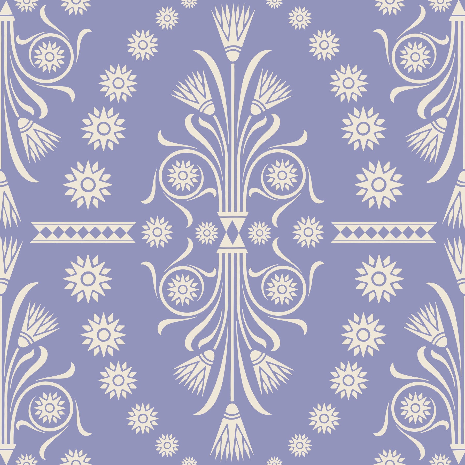 This beautifully balanced design features stylized botanical elements. Creamy lines stand out against a muted violet background. This refined symmetry adds a sense of order and peace. With this wallpaper for walls, transform your living room, bedroom, or hallway into a relaxing sanctuary. Its soothing color scheme and classic pattern will blend well with traditional or modern interior styles. Experience the simple charm that evokes a sense of timeless beauty.