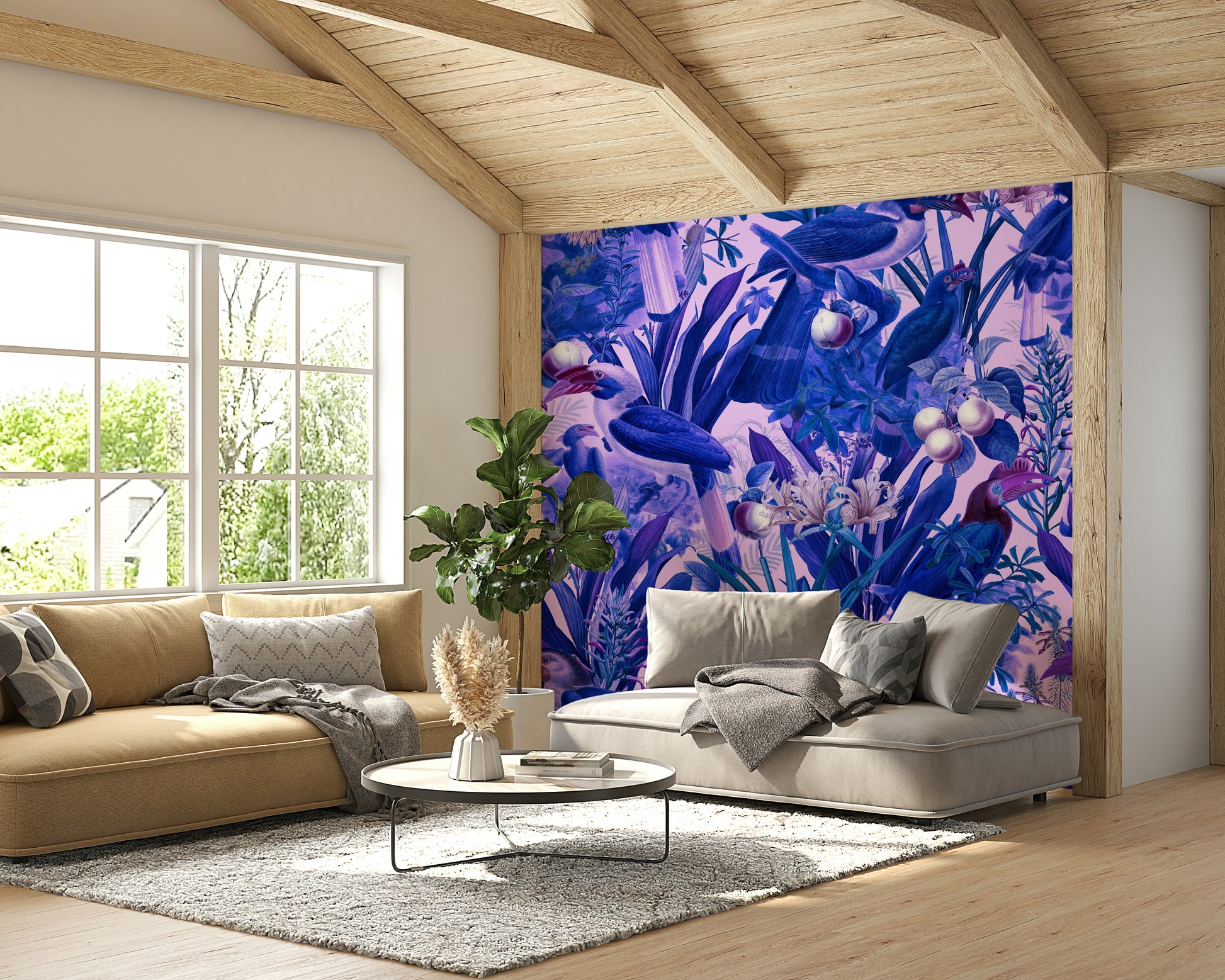 Immerse yourself in the mystical 'Purple Jungle,' a vibrant wallpaper design where exotic hornbills perch amongst lush, deep purple foliage. Intricate botanical details, including striking lilies and glistening fruits, add depth and texture to this captivating scene. The monochromatic color palette creates a dreamlike atmosphere, perfect for adding a touch of surreal elegance to any digital device. This wallpaper evokes a sense of tranquility and mystery, transporting you to a hidden world of vibrant flora and fauna rendered in a rich, enchanting purple hue. The seamless pattern ensures a captivating visual experience, no matter the screen size.