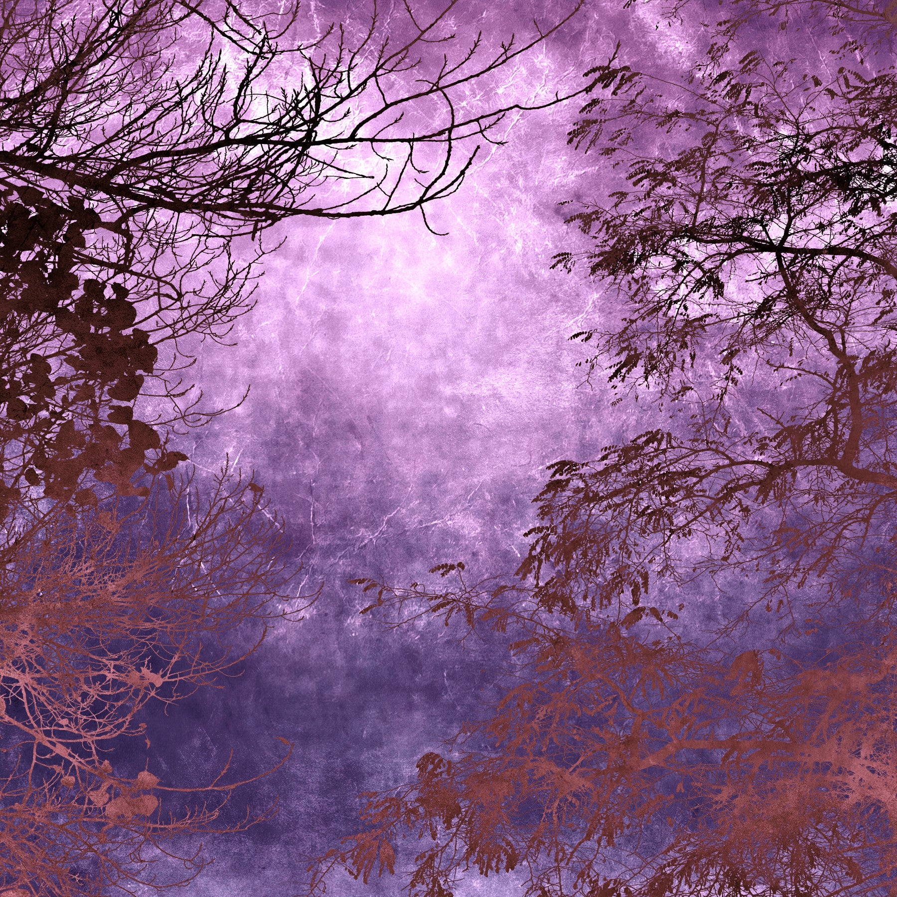 Immerse yourself in the ethereal beauty of 'Purple Woods', a captivating wallpaper that transforms your screen into a mystical landscape. This design features a textured backdrop of swirling purples, from deep indigo to soft lavender, evoking the enchanting atmosphere of a twilight forest. Silhouetted trees, rendered in shades of umber and sepia, frame the scene, their delicate branches reaching towards a softly illuminated center, casting intriguing shadows and creating a sense of depth and mystery. The overall effect is both serene and dramatic, offering a unique blend of natural beauty and artistic interpretation. 'Purple Woods' is perfect for those seeking a sophisticated and calming visual experience, adding a touch of fantasy and elegance to any device. Let the allure of this enchanted forest transport you to a world of tranquility and wonder every time you glance at your screen.