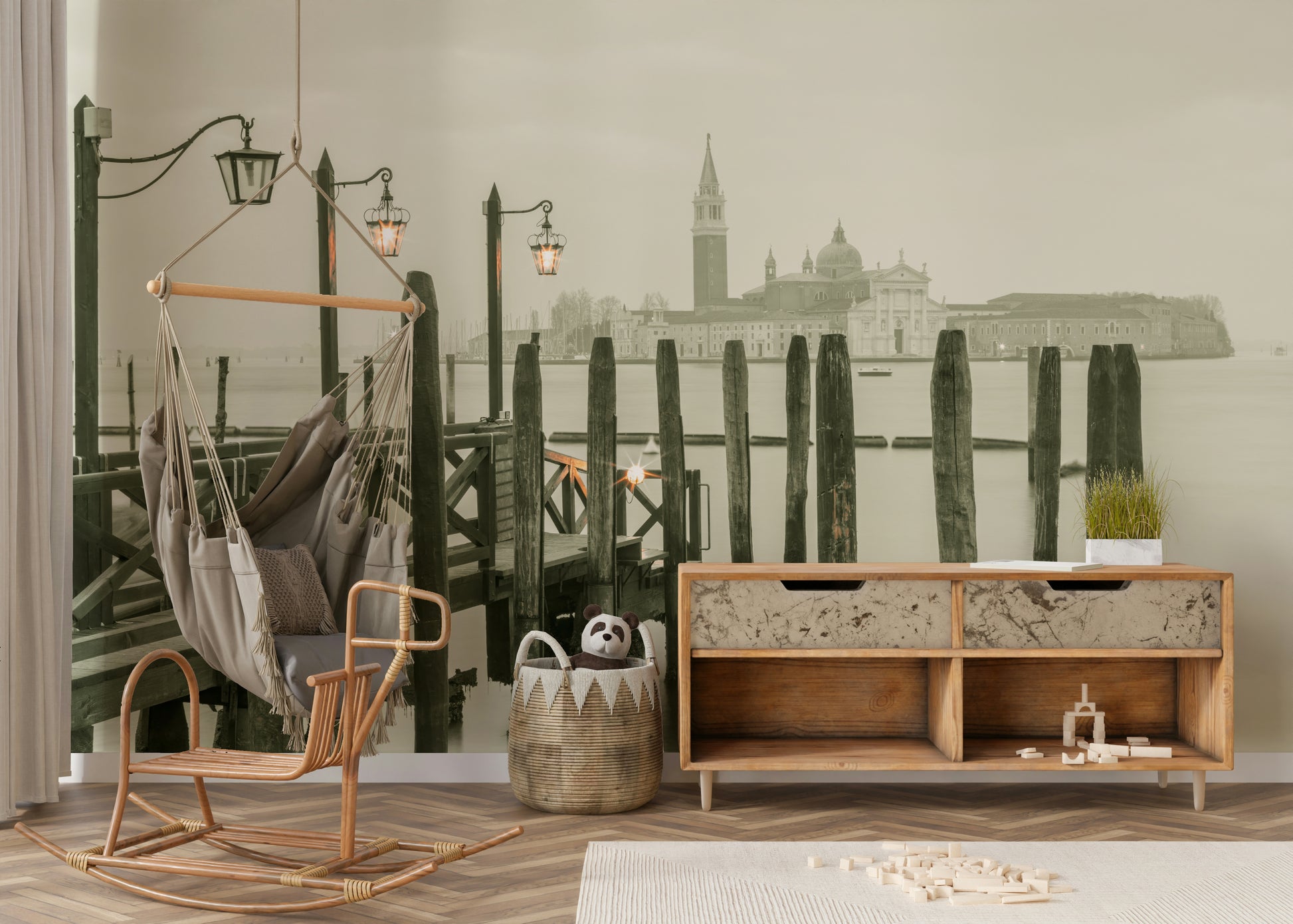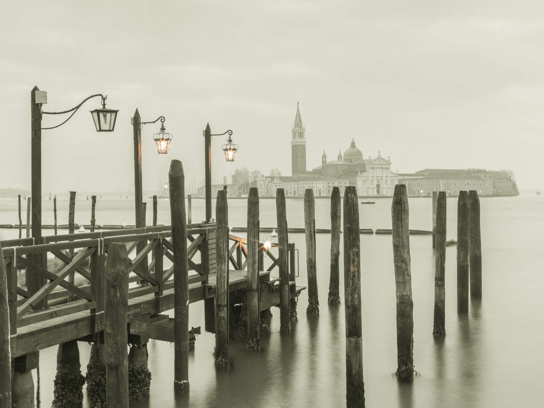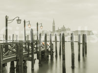 Jetty over Venetian lagoon, Venice, Italy. Immerse yourself in the serene stillness of "Quiet Waterside Reflection," a captivating wallpaper that evokes a sense of tranquility and introspection. This image presents a muted palette, showcasing a weathered wooden pier extending into the calm waters, its surface mirroring the surrounding environment. The gentle ripples create subtle distortions, adding a touch of ethereal beauty to the scene. Traditional lamp posts, adorned with glowing lanterns, stand guard along the pier, casting a warm, inviting light that contrasts with the cool tones of the water and sky.