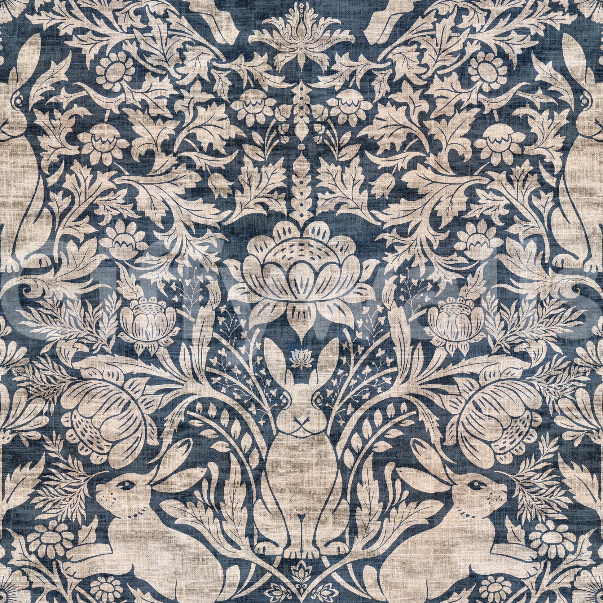 Invite nature indoors with this captivating wallpaper for walls! The intricate design features stylized rabbits amid blooming florals and foliage, creating a classic and peaceful atmosphere. Soft beige patterns on a deep blue background offer a unique contrast, making it perfect for bedrooms, living rooms, or dining areas. It adds a touch of country charm, blending effortlessly with traditional or modern interiors. Experience the timeless appeal of this refined print.