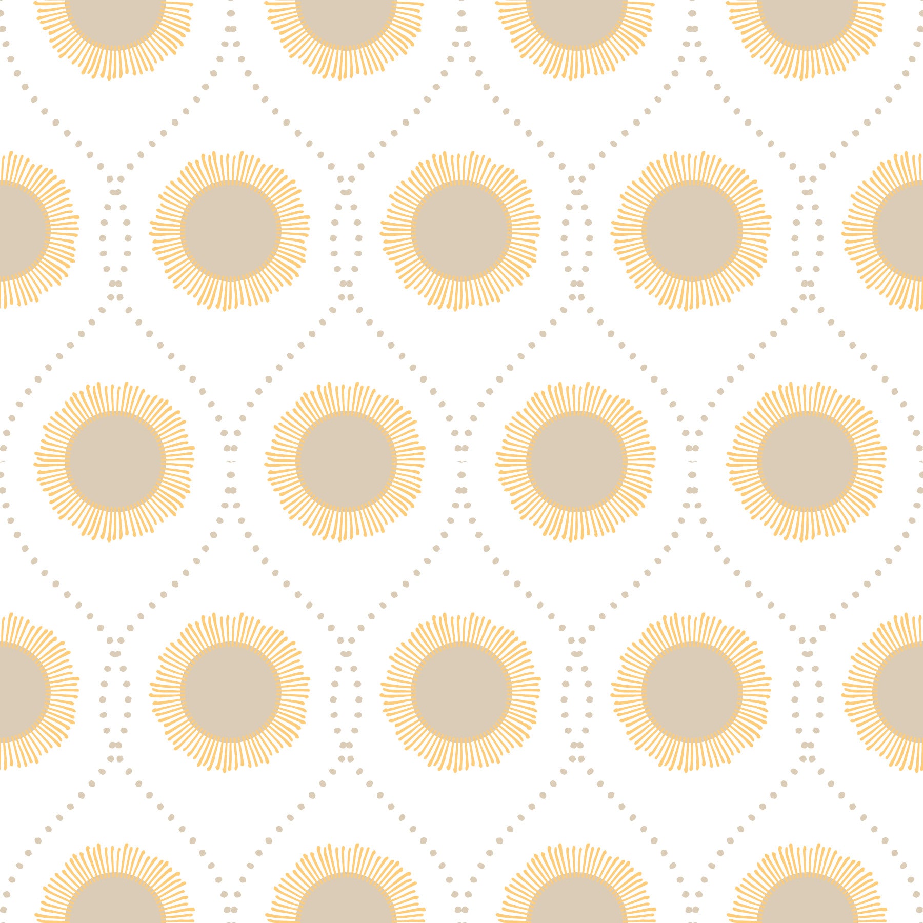 This charming wallpaper design features sunbursts in a soft beige hue, creating a warm and inviting ambiance. The dotted lines form a subtle geometric pattern that balances the design and adds visual interest. It is a great wallpaper for walls in a bedroom, nursery, or living room. The gentle colour palette suits Scandinavian and boho decors. Use this pattern to add a touch of warmth to any room.