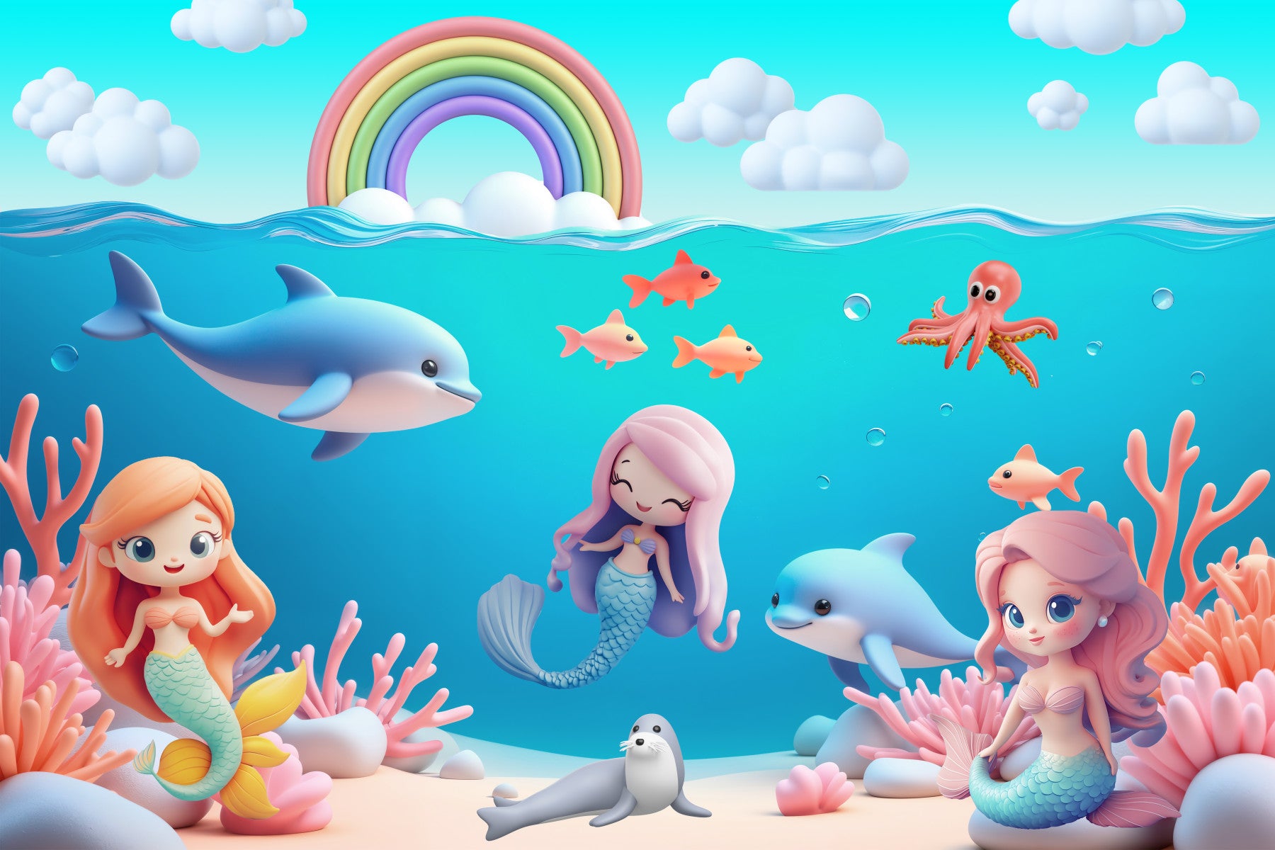 Escape to a magical marine world with this charming wallpaper. The design stars sweet mermaids, smiling dolphins, and a bright rainbow against an ocean backdrop. This wallpaper for walls creates a cheerful and inviting space, making it perfect for a kids' bedroom or bathroom. The soft, pastel colors and cartoon style add warmth to interiors. Turn any room into a fun underwater playground.