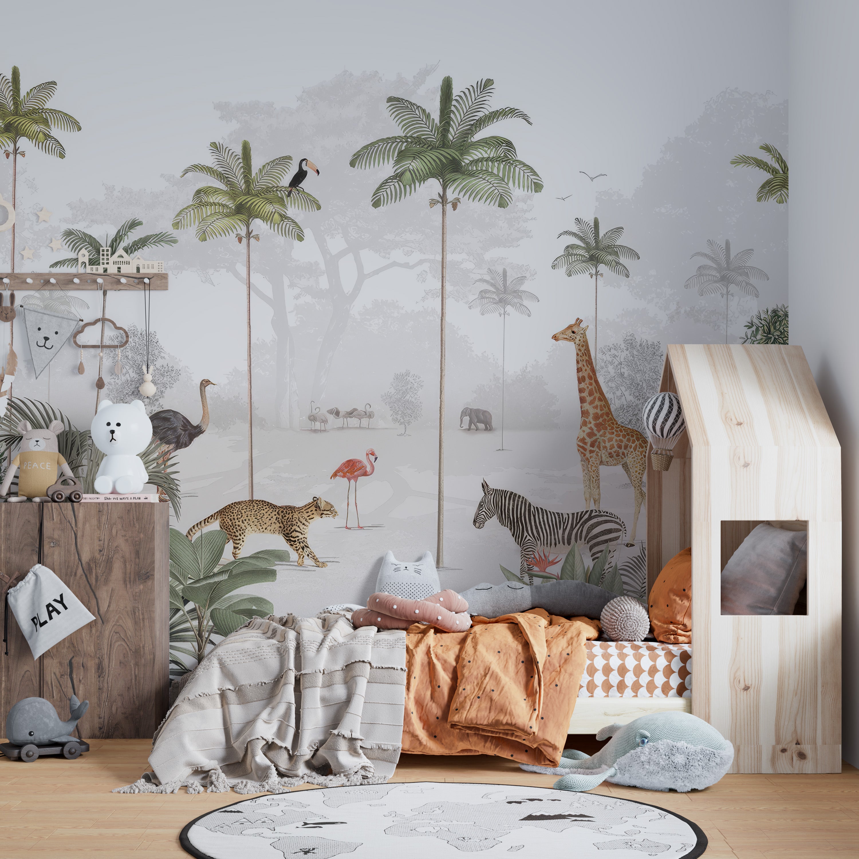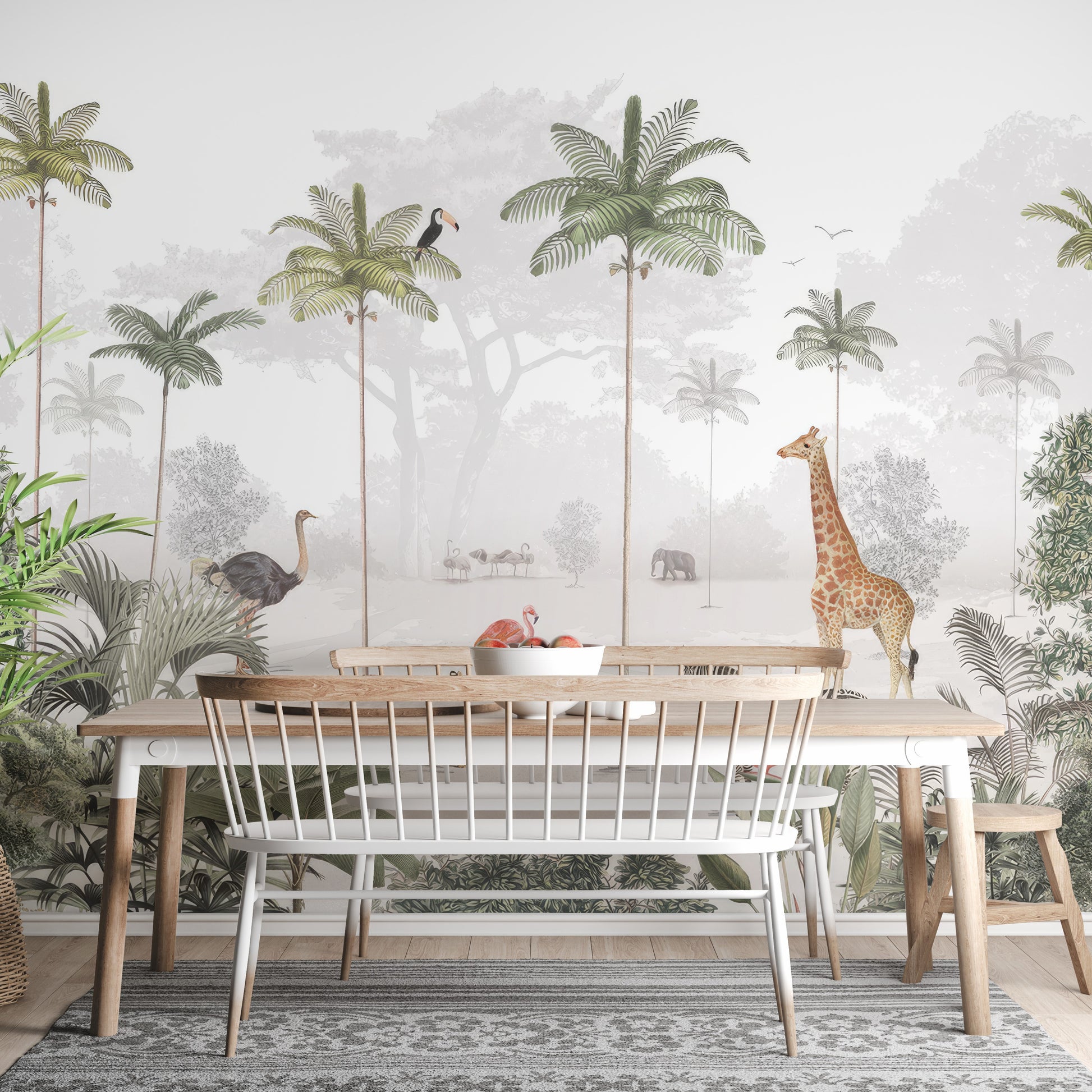 Create a serene oasis using our rainforest animal mural, featuring a tropical wallpaper. Picture gentle giants of the jungle and vivid avian life amidst verdant foliage. This wallpaper brings a breath of fresh, natural air to any room, offering a vibrant backdrop for everyday living. Perfect for a child’s playroom or a nature lover’s den, this Tropical Wallpaper invites the wild's magic inside, sans the chaos. Embrace nature's untamed beauty in your home.