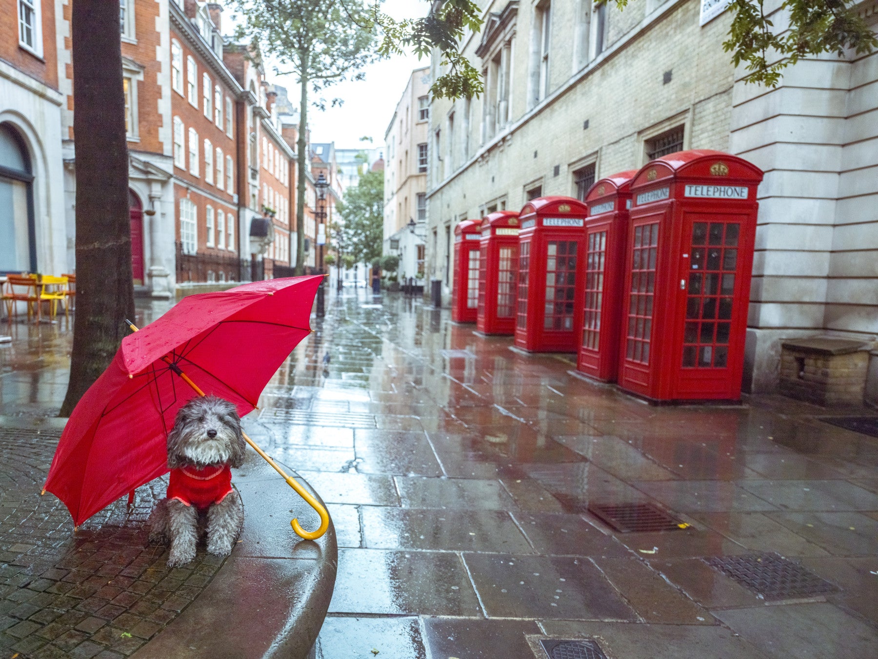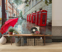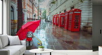 Bring a touch of London charm to any space with this delightful wallpaper. It features a cute dog sheltering under a bright red umbrella against the backdrop of iconic British telephone boxes and wet cobblestones. The scene evokes a serene and slightly whimsical mood. This wallpaper for walls adds a pop of colour and personality to your decor. Imagine it brightening up a hallway, kid's room, or even a modern home office. The design blends well with various interiors, from contemporary to classic, adding a unique touch to any space. Let this delightful scene transform your walls.
