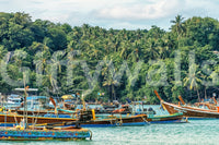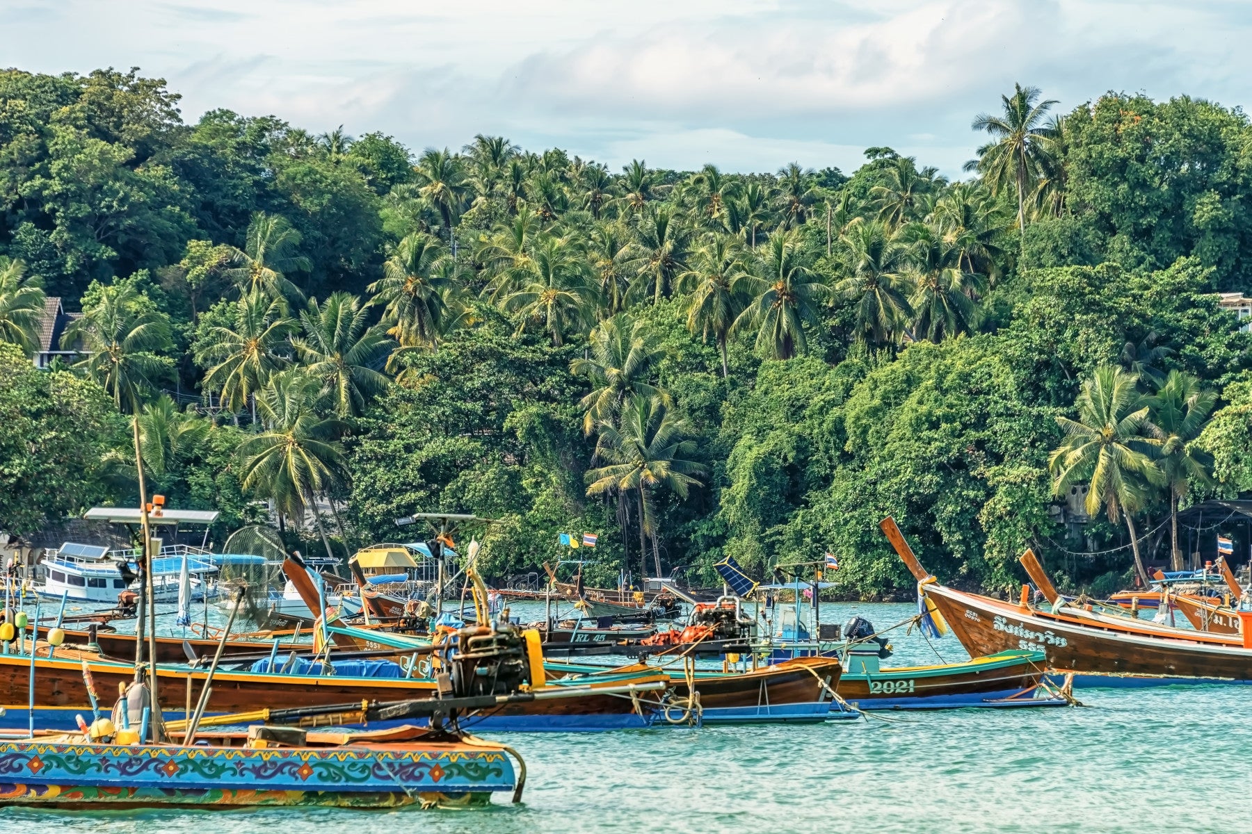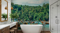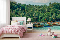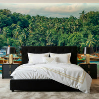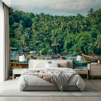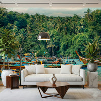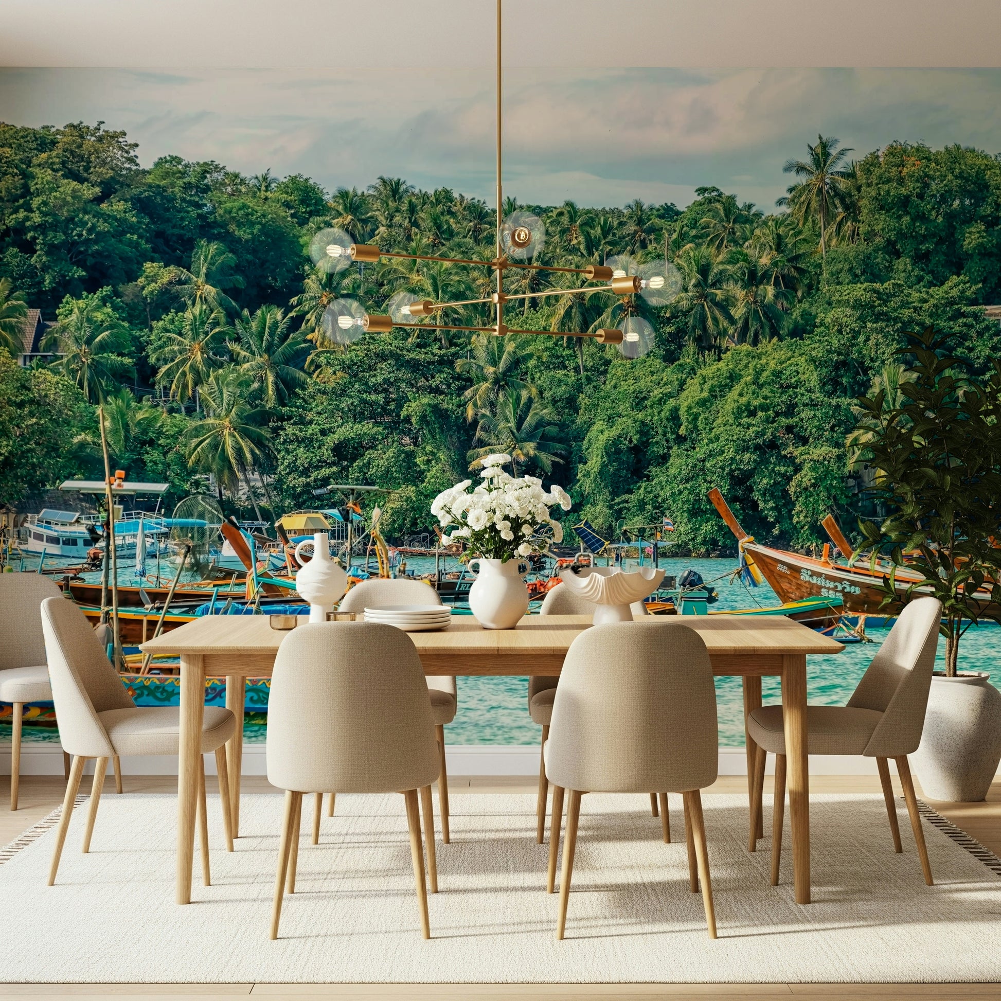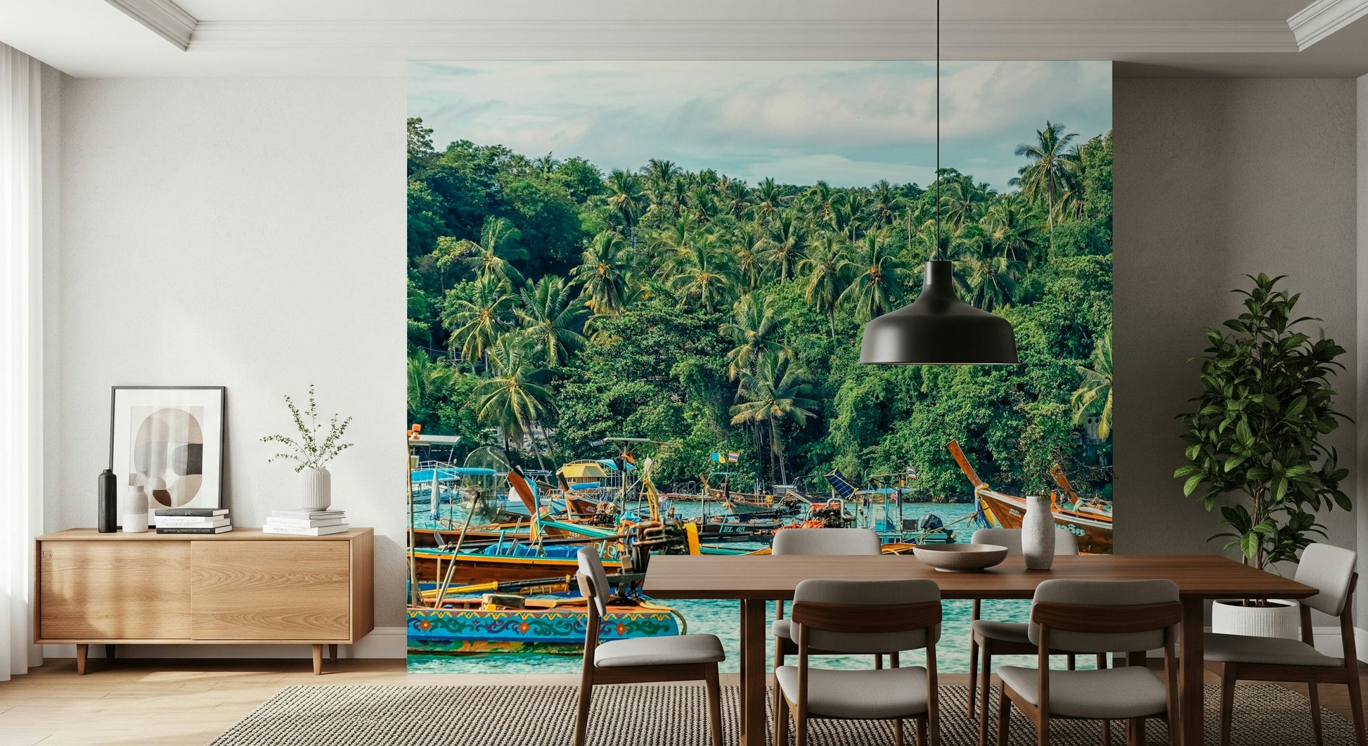 Elevate your home's atmosphere with this captivating coastal scene. This tropical harbour wallpaper for walls features colourful Thai boats gently floating in turquoise water, embraced by lush green palm trees. The vibrant hues create an inviting and relaxed ambience, ideal for any room in your home. It is perfect for a living room, bedroom, or even a home office. This wallpaper adds a fresh, tropical touch that harmonises with various interior styles, creating a statement wall with coastal charm and enhancing your living space.