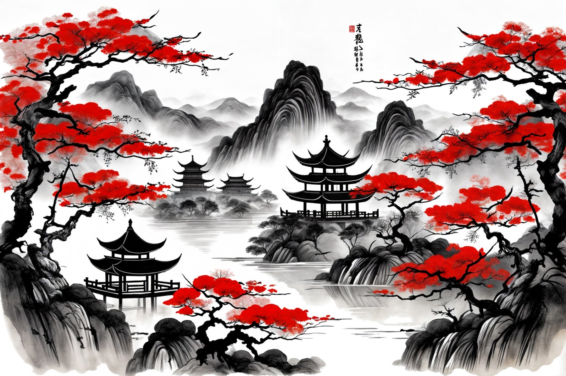 Immerse your space in the elegance of this scenic wallpaper. The design features traditional pagodas nestled among misty mountains and vibrant red blossoms. The monochrome palette creates a peaceful backdrop, punctuated by the striking red hues of the trees. Use this wallpaper for walls to bring a touch of Asian-inspired serenity to your living room, bedroom, or dining area. The harmonious design beautifully complements minimalist and classic interiors.