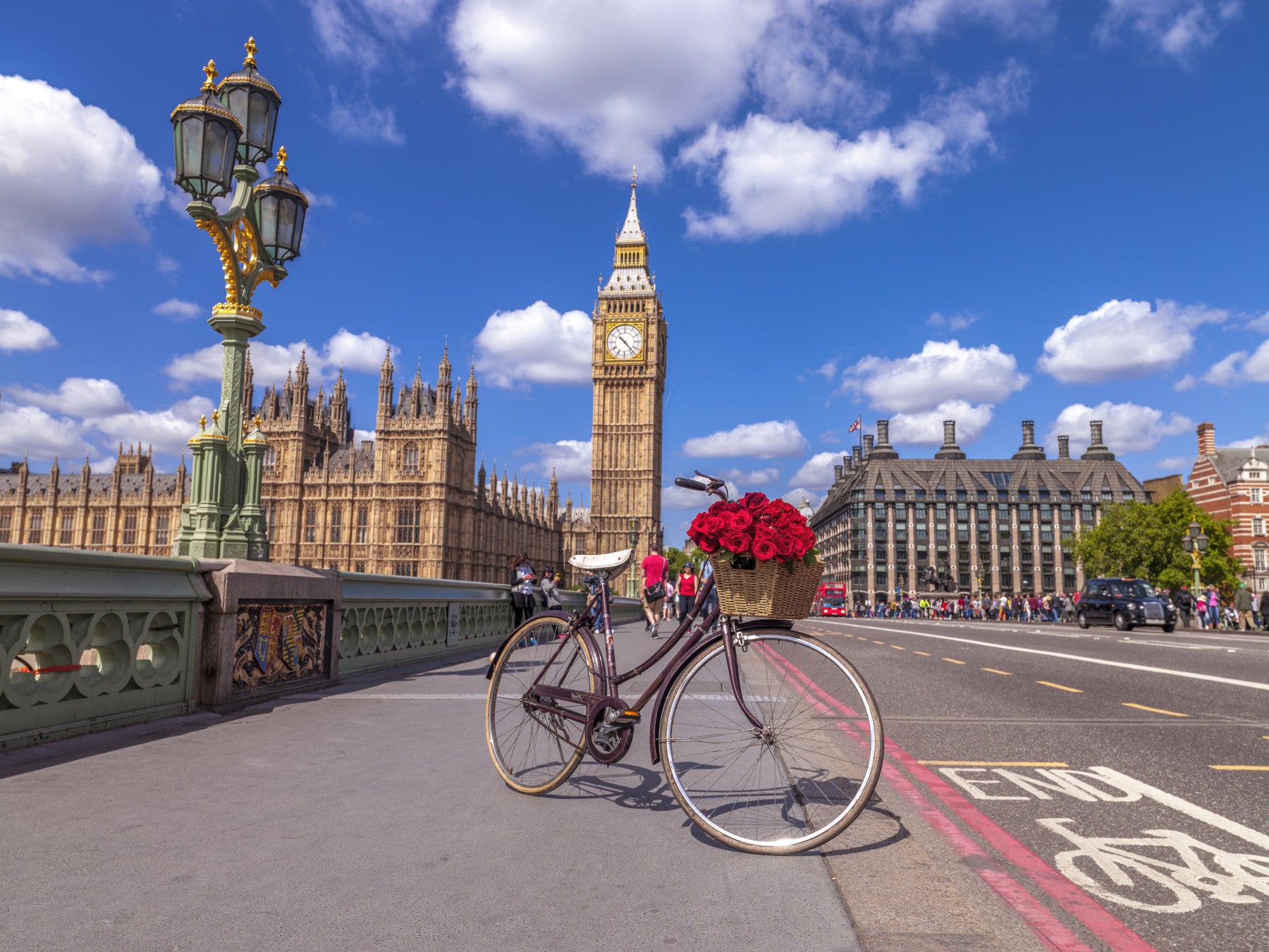 Bring London's iconic landmarks into your home with this beautiful wallpaper for walls. The design features a classic bicycle with a basket overflowing with red roses, set against the backdrop of Big Ben and the Houses of Parliament. The vibrant colours contrast beautifully with the historic architecture, creating a captivating scene. This wallpaper is perfect for a living room, study, or bedroom, adding a touch of elegance and wanderlust to your interior. Transform your space with this unique design.