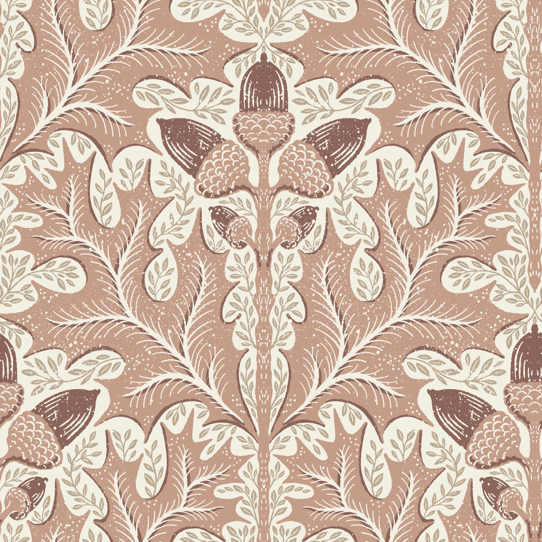 Indulge in the rustic elegance of 'Red Oak Damask-05', a wallpaper design that seamlessly blends nature's beauty with classic damask patterns. The earthy palette of blush pinks and creamy off-whites showcases stylized red oak leaves and acorns, arranged in a captivating symmetrical design. A subtle textured effect adds depth and a touch of vintage charm, creating a sophisticated yet comforting atmosphere. Perfect for adding warmth and understated style to any room, this wallpaper evokes a sense of peaceful tranquility with its organic motifs and muted tones. The intricate details and repetitive pattern create a rich visual experience, ideal for enhancing walls with a touch of nature-inspired sophistication.