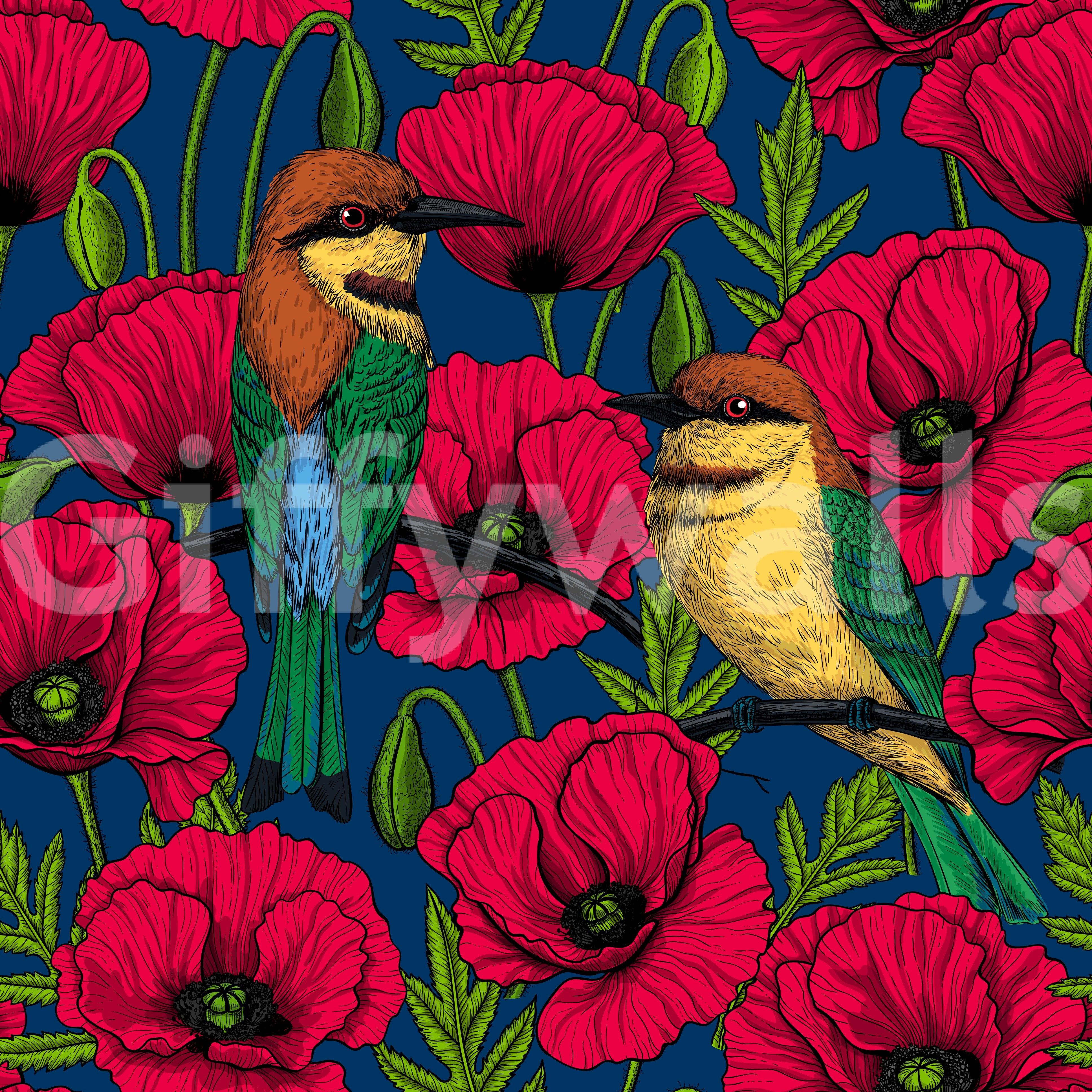 Immerse yourself in a vibrant tapestry of nature's beauty with this stunning wallpaper. A rich, deep blue background provides the perfect canvas for a captivating arrangement of crimson red poppies and exquisitely detailed bee-eaters. The birds, with their iridescent plumage of emerald, gold, and azure, perch delicately amongst the bold blooms, creating a striking contrast that pops with energy. This meticulously crafted design offers a sophisticated yet playful aesthetic, perfect for adding a touch of exotic elegance to any wall. Experience the exquisite interplay of color and form in this vibrant and unforgettable wallpaper.