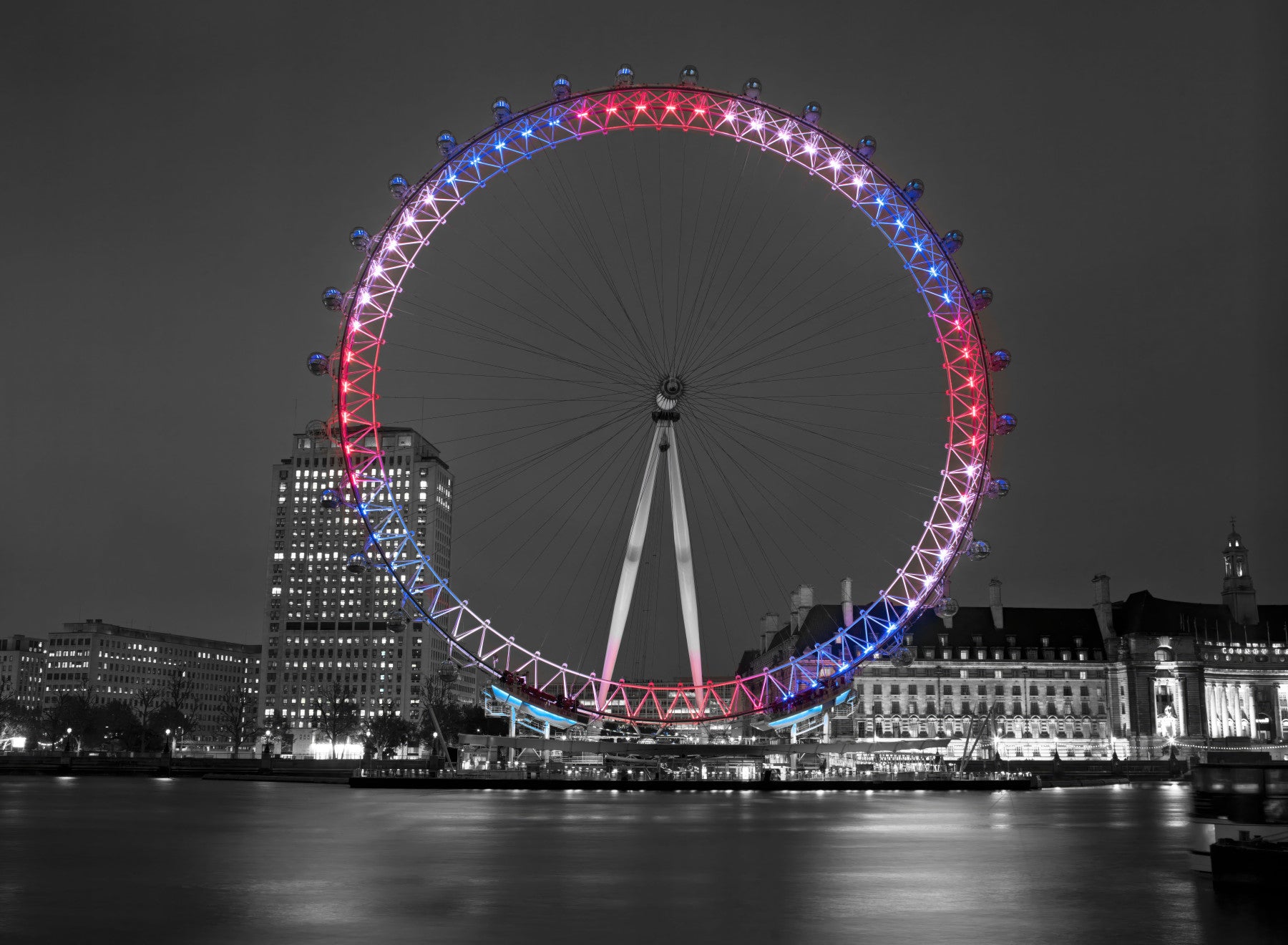 Gaze into the heart of London with "Reflecting Eye," a mesmerising wallpaper that captures the iconic London Eye against a dramatic, grayscale cityscape. The wheel, illuminated in vibrant hues of red and blue, stands as a beacon of modern marvel and a mirror to the city's pulsating energy. The monochromatic backdrop accentuates the vivid colours, drawing your eye and creating a captivating focal point. Watch as the still water reflects the vibrant lights, creating a sense of depth and an opportunity for contemplation. This wallpaper evokes a sense of wonder and adventure. Transform your digital space into a window overlooking the captivating skyline of London with this contemporary, eye-catching design.