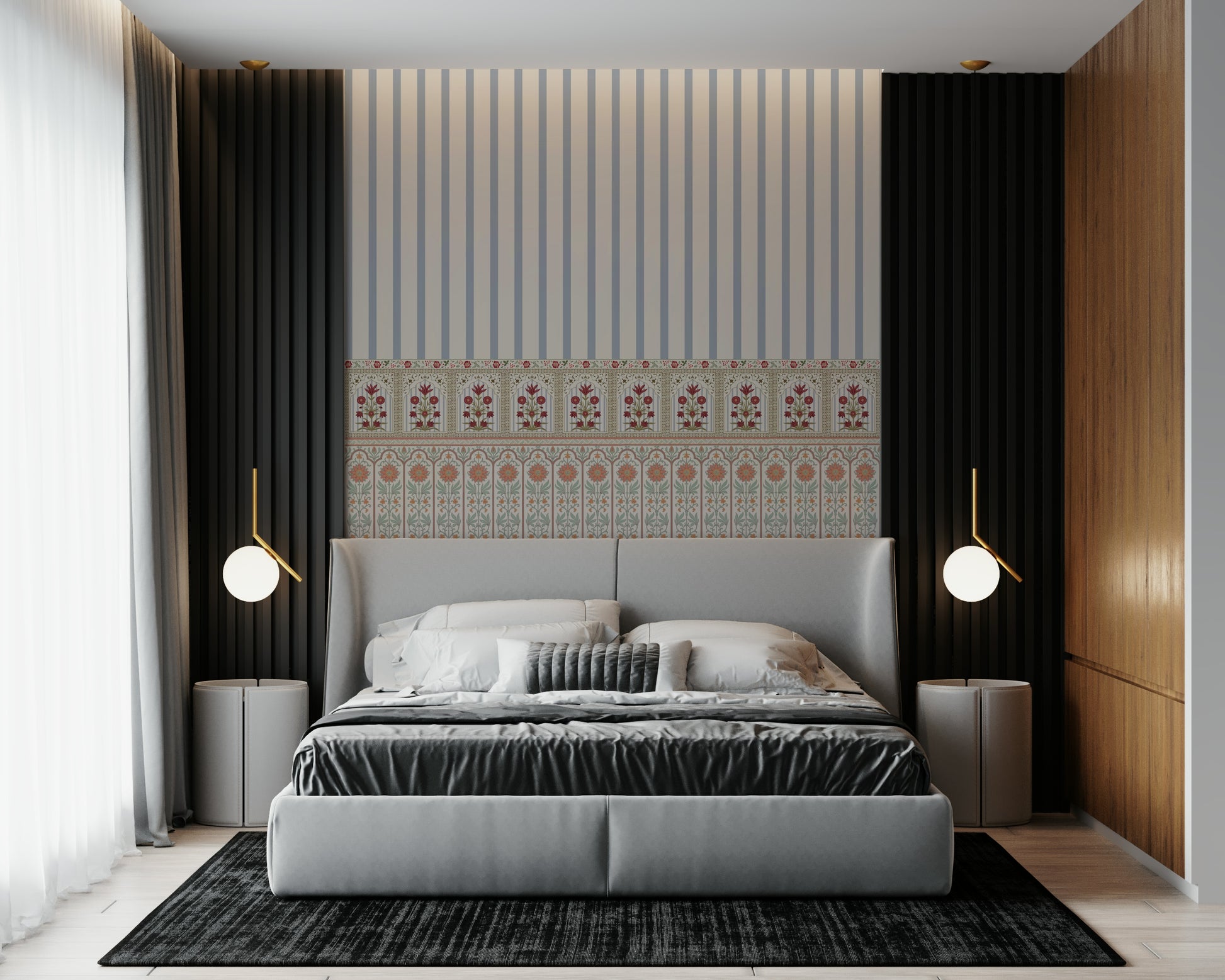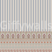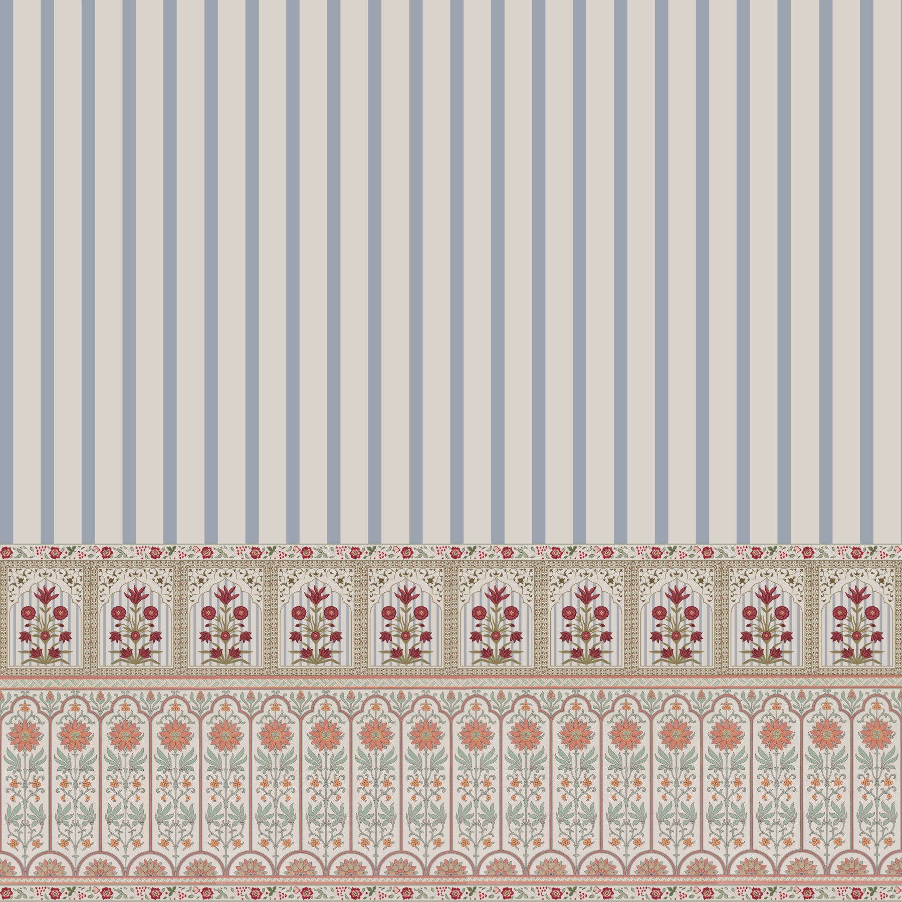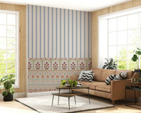 Elevate your walls with this refined, traditional design. Soft, dusty blue stripes accent detailed floral patterns in coral and burgundy. The design brings a calming elegance to living rooms, dining rooms, or bedrooms, creating a serene and sophisticated atmosphere. This wallpaper for walls presents an understated yet luxurious aesthetic, perfect for enhancing interiors with subtle colour and refined details. Transform your space into a sanctuary of style with this captivating wallpaper.