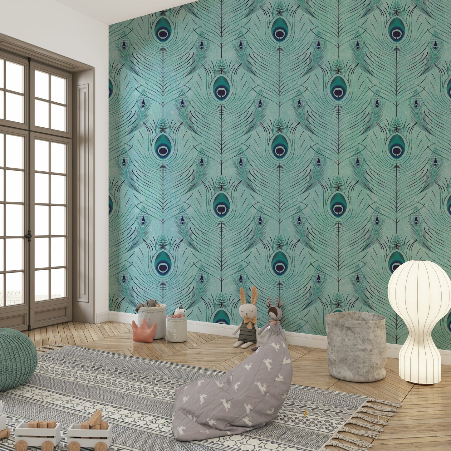 Peacock-themed wallpaper mural