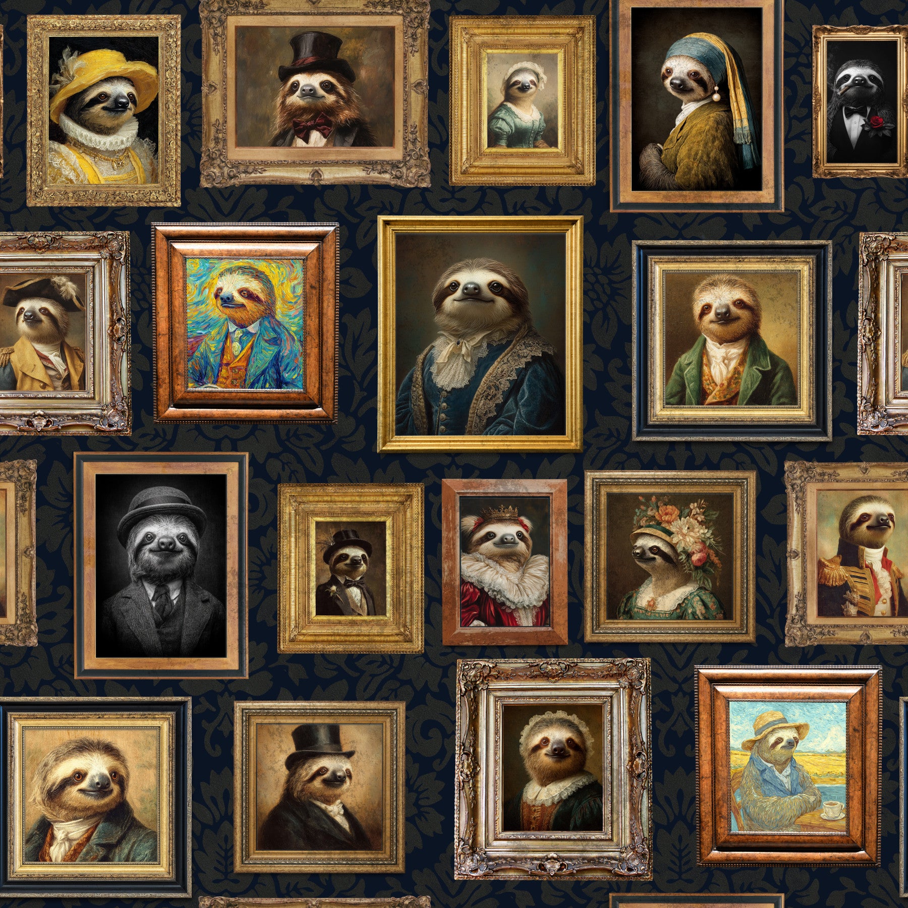 Step into a world where slow and steady wins the race to sophistication with the 'Regal Sloths Gallery' wallpaper. This captivating design showcases a collection of exquisitely framed sloth portraits, each a masterpiece of reimagined classical art. From sloths adorned in elegant period attire to those styled after iconic paintings, every detail exudes charm and whimsy. Imagine a sloth as Vermeer's 'Girl with a Pearl Earring' or as a dignified gentleman in a top hat! The diverse styles and ornate frames create a gallery-like effect, set against a backdrop of intricate, dark floral patterns. This wallpaper adds a touch of humor and artistic flair to any room, perfect for those who appreciate a blend of high art and lighthearted fun. Transform your space into a haven of slow-paced elegance and let these regal sloths reign supreme on your walls.