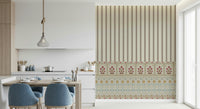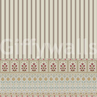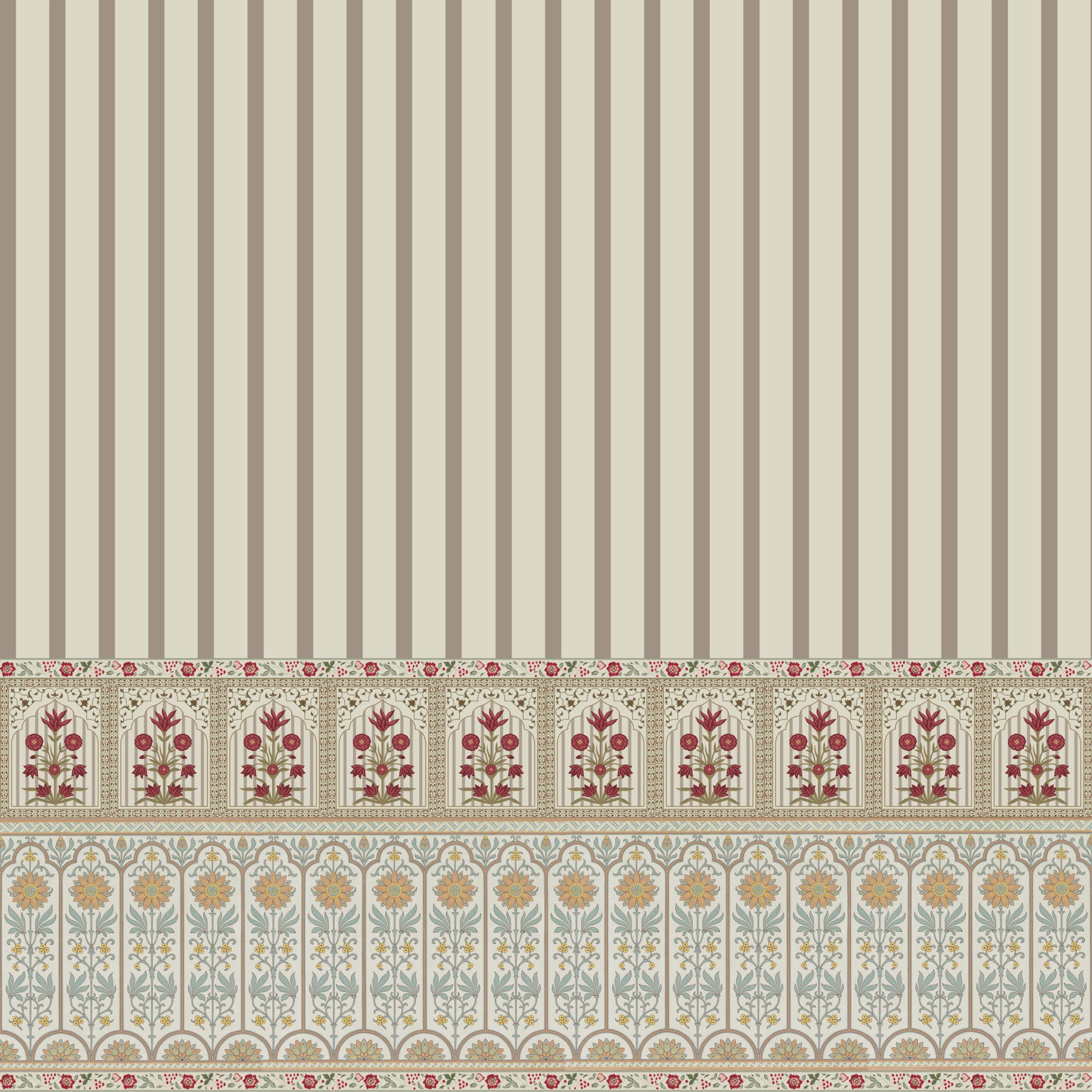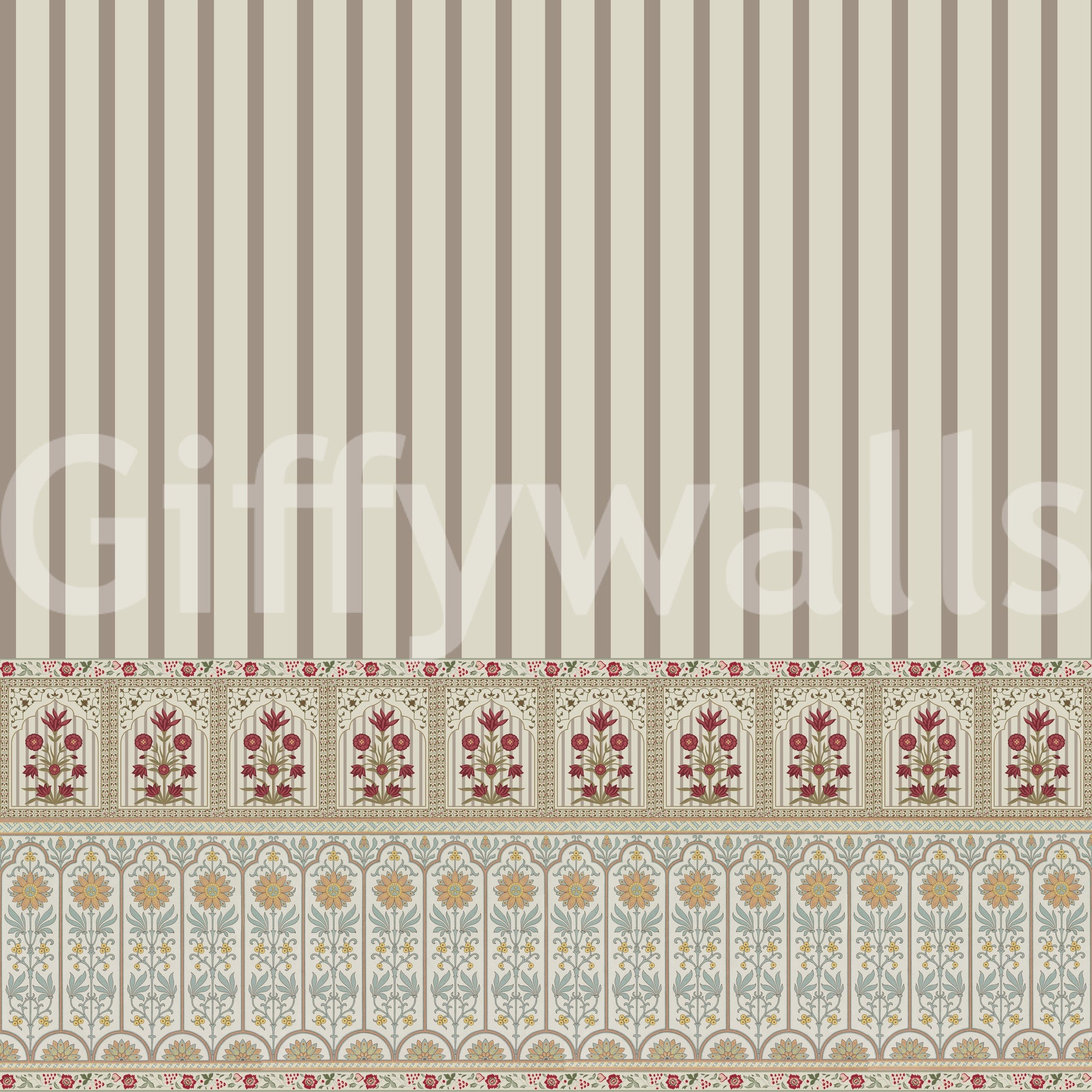 Introduce a touch of refined elegance with this ornate wallpaper for walls. The design presents classic vertical stripes in soft beige and tan, offering a sophisticated backdrop. Ornate floral patterns with rich burgundy and gold hues grace the bottom section, creating a refined border effect. This wallpaper enhances dining rooms, hallways, or bedrooms with a touch of sophistication. Its pattern creates a welcoming atmosphere, perfect for interior spaces where a sense of heritage and luxury is desired. This wallpaper’s blend of simplicity and elegance elevates walls into works of art.