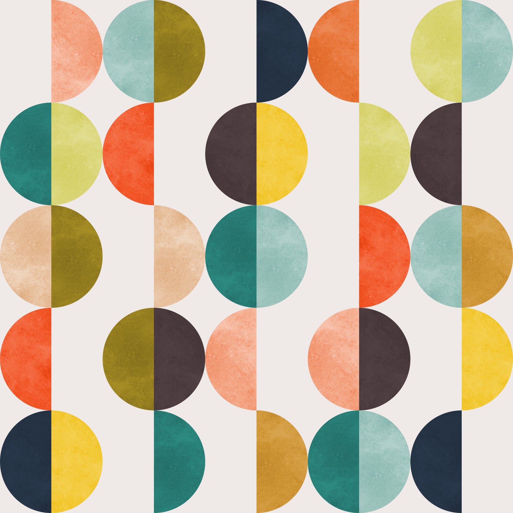Evoke a touch of mid-century charm with this geometric wallpaper. It showcases a repeated design of semi-circles in a color palette that includes orange, brown, teal and yellow. The pattern is both bold and balanced, offering a vibrant yet calming effect, perfect as wallpaper for walls. Use this striking design to enhance a living room, bedroom, or dining room. It injects character and makes a space feel both retro and refined.