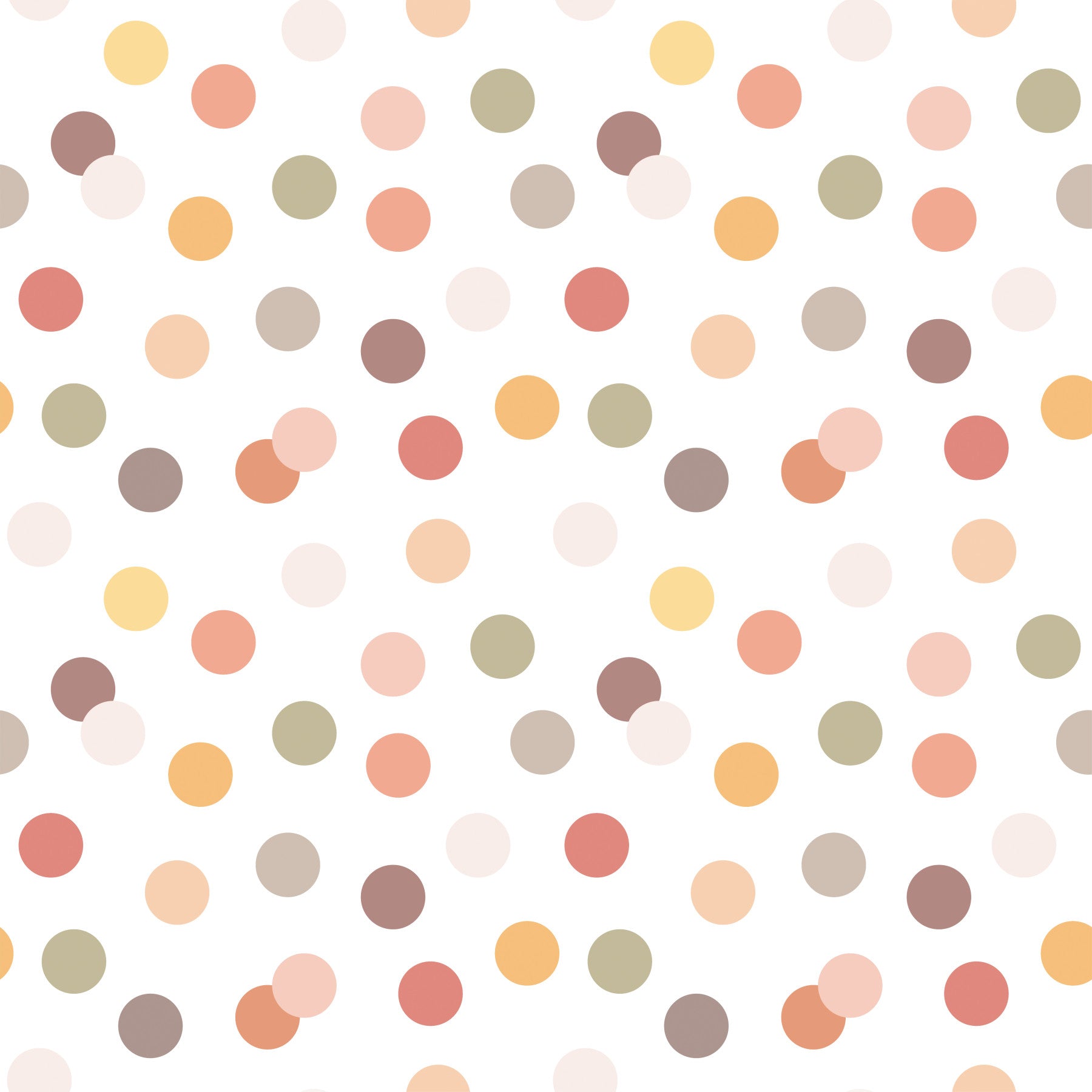 Step back in time with this cheerful spot pattern. This wallpaper for walls features a seamless array of colourful spots on a white background. Earthy and soft hues create a fun and vintage mood. This design will complement any room, including a kids' room, nursery, or hallway. It adds personality and brightness to interiors, making every space feel fresh and joyful.