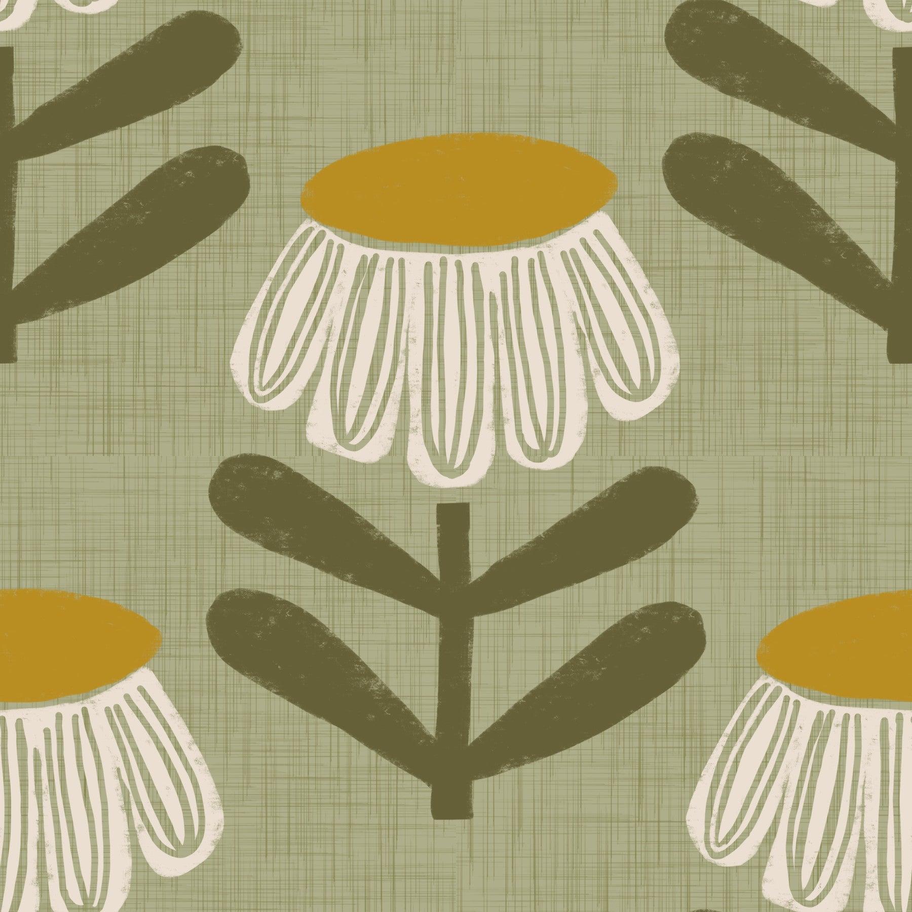 Embrace mid-century modern style with this captivating wallpaper featuring stylized daisies in a calming sage green palette. The design blends a retro aesthetic with a contemporary feel, showcasing simplified floral forms and muted earth tones. The off-white daisy petals contrast beautifully against the mustard yellow centers, creating a visually appealing texture. The subtle linen-like background adds depth and a touch of organic warmth, perfect for creating a serene and sophisticated atmosphere in any room. This wallpaper is an elegant blend of vintage charm and modern minimalism.