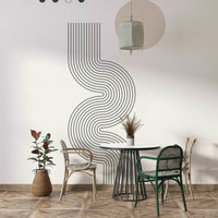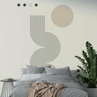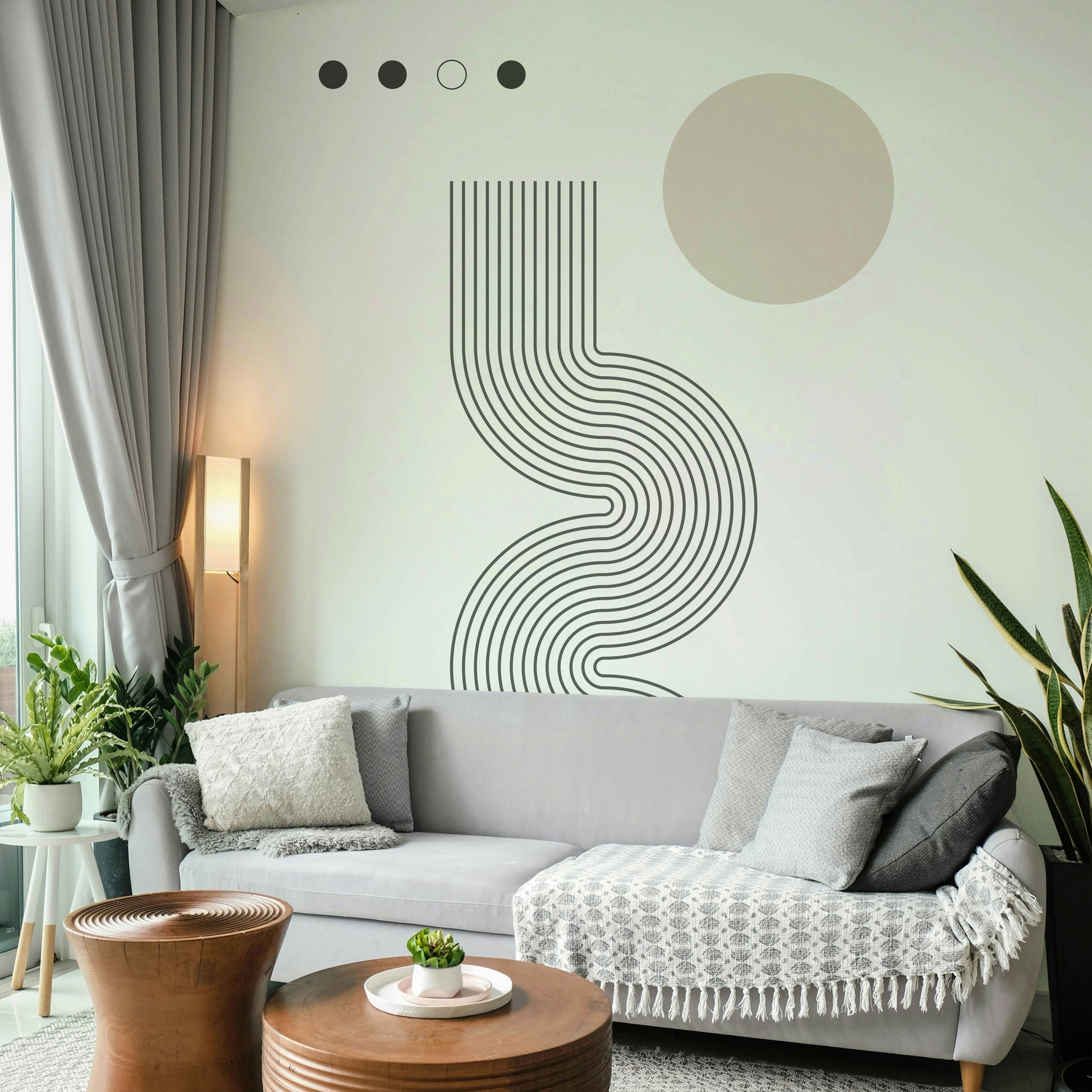 Experience the serene elegance of "Retro Geometric Flow," a minimalist wallpaper design. Clean lines and subtle curves create a captivating visual rhythm, reminiscent of mid-century modern aesthetics. The flowing, parallel lines form a dynamic yet calming central motif, complemented by the soft beige circle and strategically placed dark and light dots. This sophisticated wallpaper evokes a sense of understated sophistication and timeless design, perfect for adding a touch of retro charm to any room.