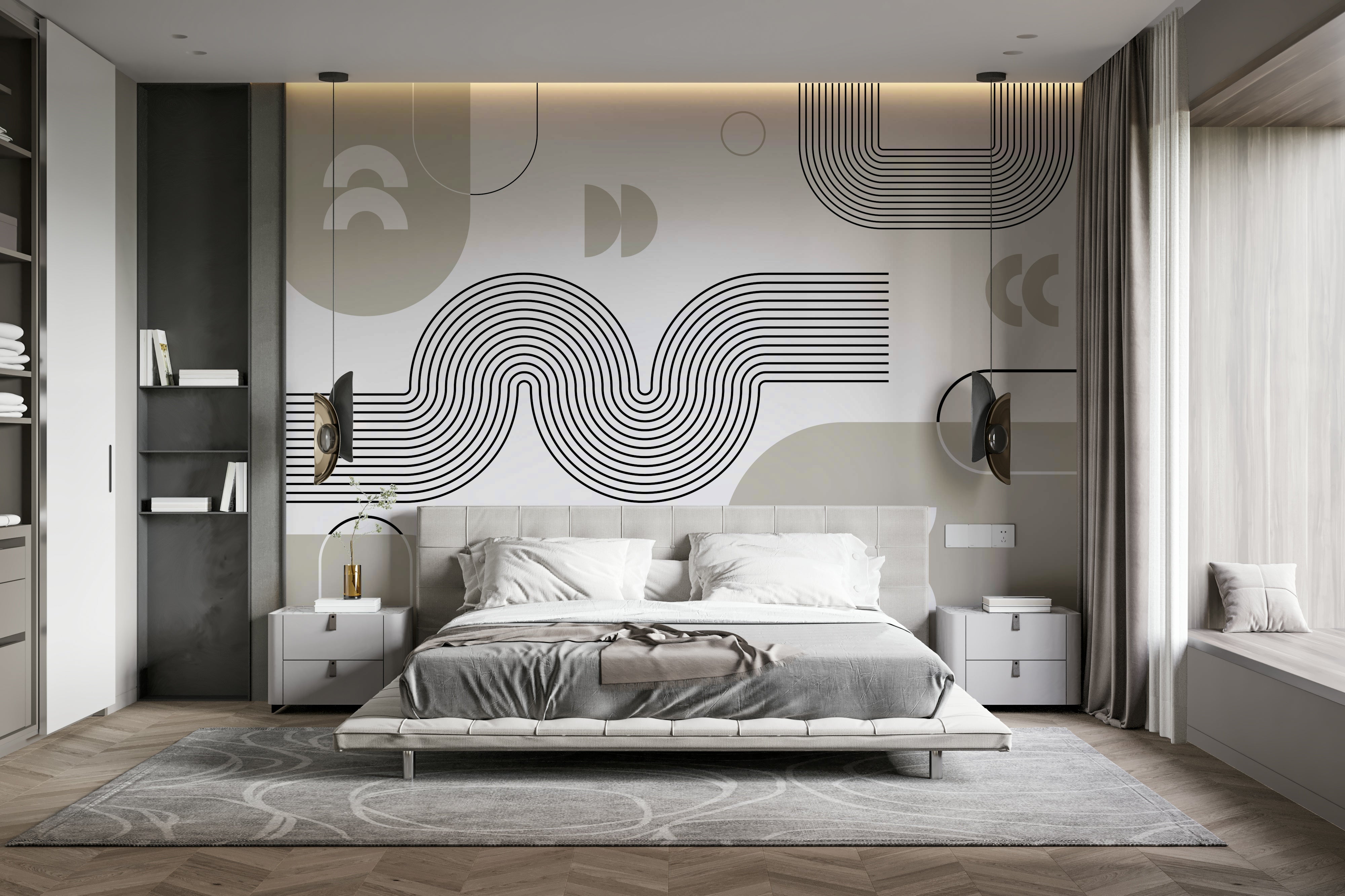 Dive into a world of elegant minimalism with this "Retro Geometric Waves" wallpaper. Clean lines and subtle curves create a captivating visual rhythm, reminiscent of mid-century modern design. The interplay of flowing black-and-white concentric waves against a calming neutral taupe palette evokes a sense of serene sophistication. Simple geometric shapes punctuate the design, adding a touch of playful asymmetry to the balanced composition. This wallpaper is perfect for those seeking a sophisticated yet calming backdrop for their space, blending timeless aesthetics with contemporary flair.