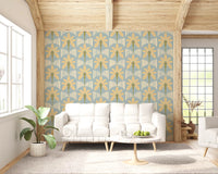 Introduce a refreshing mid-century vibe to your home with this charming wallpaper for walls. The design features elegant, stylized palm motifs, each boasting broad, peach-toned leaves outlined in soft yellow. Slender olive-green trunks rise against a serene, dusty blue background. Cream-coloured vertical stripes form a rhythmic geometric pattern, creating an intriguing visual depth behind the botanical elements. This unique blend of organic shapes and clean lines captures a playful yet sophisticated retro aesthetic. It perfectly complements living rooms, dining areas, or hallways, adding a touch of tranquil elegance. The muted colour palette enhances relaxation, creating a cohesive and inviting atmosphere in modern or vintage-inspired interiors.
