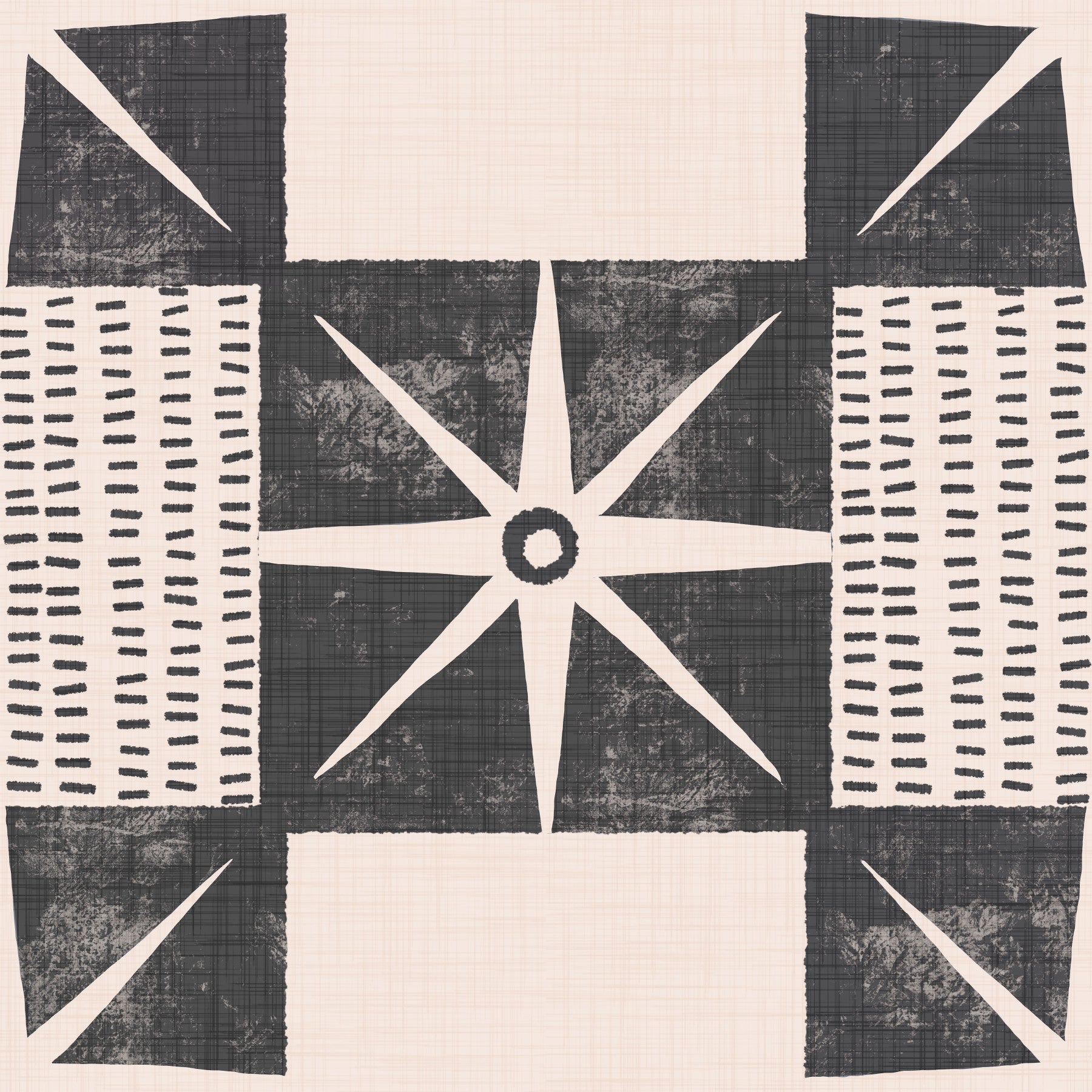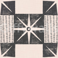 This minimalist mid-century modern wallpaper design features a striking charcoal grey and off-white starburst quilt block. The retro aesthetic is enhanced by a subtly textured background reminiscent of linen fabric, giving it a tactile feel. The graphic starburst is framed by geometric shapes and textured lines, creating a sophisticated yet playful pattern. The muted color palette adds a sense of calm and sophistication, perfect for a contemporary space seeking a touch of vintage charm. This wallpaper seamlessly blends modern design sensibilities with the nostalgic appeal of mid-century style, offering a stylish and understated backdrop for any room.