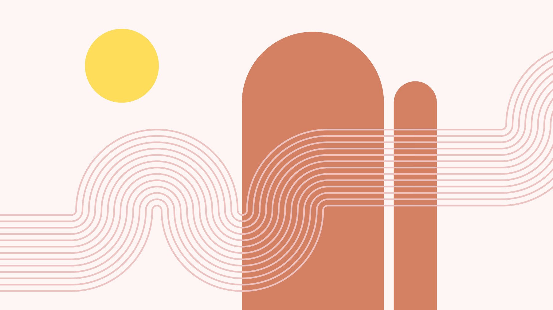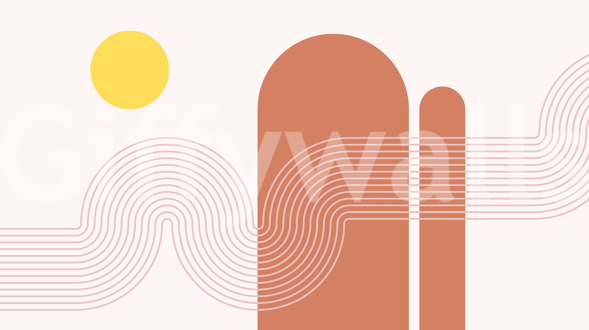 Embrace the serene beauty of a minimalist sunset with this captivating wallpaper. Soft blush pink lines elegantly curve across a calming pale pink background, evoking the gentle movement of twilight. Earthy terracotta shapes, reminiscent of stylized hills or arches, add a grounding element. A bright yellow sun adds a touch of warmth and vibrancy, completing this tranquil yet striking design. Perfect for creating a peaceful and aesthetically pleasing atmosphere in your child's nursery or playroom. This wallpaper embodies the essence of minimalist design, focusing on simple forms and a harmonious color palette to capture the calming mood of a sunset.