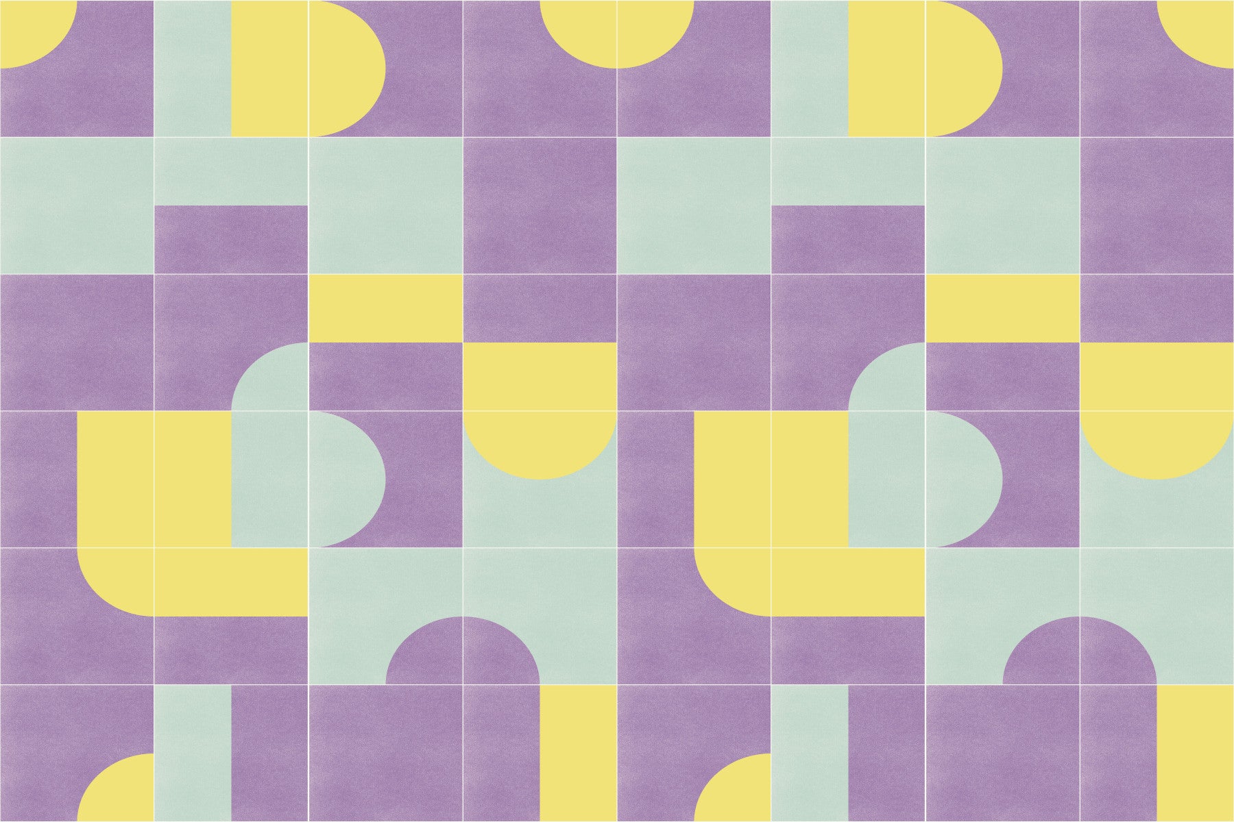 Step back in time with Retro Tiles 07 a vibrant and playful wallpaper design that evokes the charm of mid-century modern aesthetics. This design features a captivating arrangement of geometric shapes – squares and semi-circles – rendered in a harmonious palette of muted lilac, soft mint green, and sunny yellow. The textured finish gives the tiles a tactile, almost fabric-like feel, adding warmth and depth to the visual experience. 'Retro Tiles 07' is a perfect choice for those seeking a touch of nostalgia with a contemporary twist. It's bold yet soothing, making it ideal for creating a feature wall, sprucing up a home office, or adding a retro vibe to any space. Inject some retro flair into your digital world with this eye-catching tile pattern!