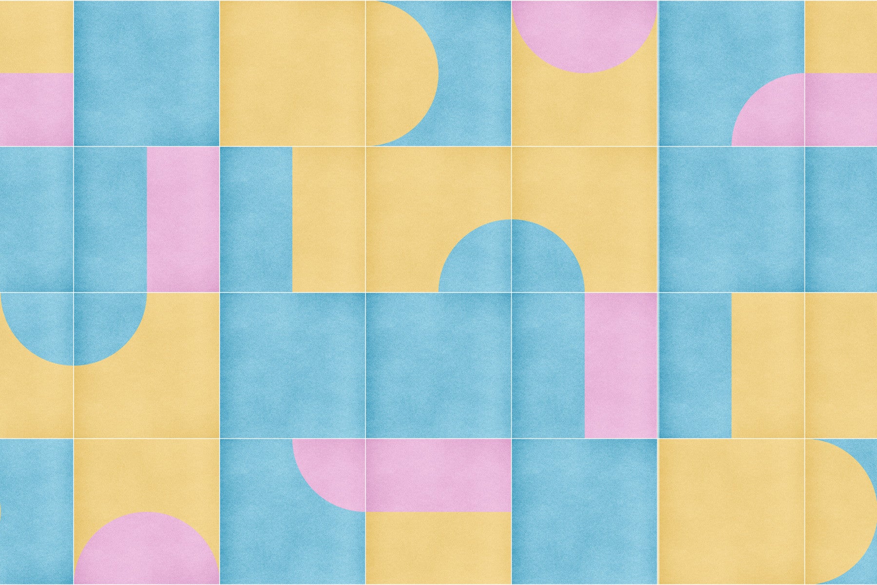 Step back in time with Retro Tiles 12 a wallpaper that embodies the playful spirit and bold geometry of mid-century modern design. This eye-catching pattern features a captivating arrangement of pastel-hued squares and semi-circles, rendered in soft, textured shades of sky blue, sunny yellow, and delicate pink. The subtle fabric-like texture adds depth and visual interest, lending a tactile feel to your digital space. "Retro Tiles 12" is more than just a background; it's a statement piece that brings a touch of vintage charm and cheerful optimism to your screen. Perfect for adding a splash of retro cool to any device, this wallpaper is sure to brighten your day with its vibrant yet soothing color palette and engaging geometric composition.