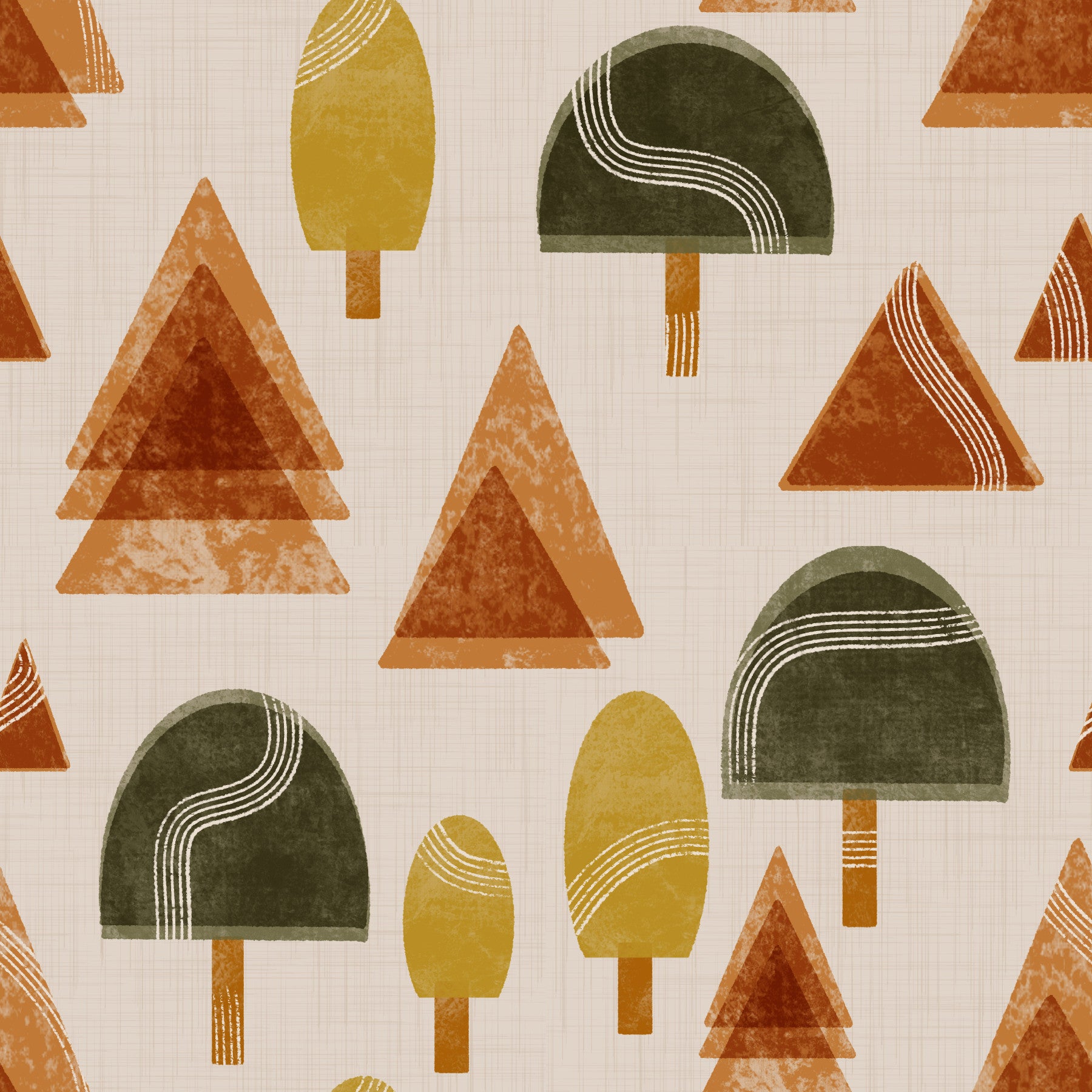 Step back in time with our Retro Woodland Tapestry a mid-century modern wallpaper showcasing stylized trees in a delightful, repeating pattern. Evoking a sense of cozy nostalgia, this design features abstract, geometric tree shapes – triangles and rounded forms – rendered in a warm, earthy palette of rust, olive green, and mustard yellow. The textured, canvas-like background adds depth and tactile appeal, reminiscent of vintage fabrics and hand-printed textiles. Clean, white linework details subtly adorn the tree canopies, adding a touch of minimalist sophistication. Perfect for creating a serene and stylish ambiance in any room, this wallpaper brings the charm of a retro woodland escape to your home. Embrace the timeless appeal of mid-century design with this captivating and easy-to-love pattern.