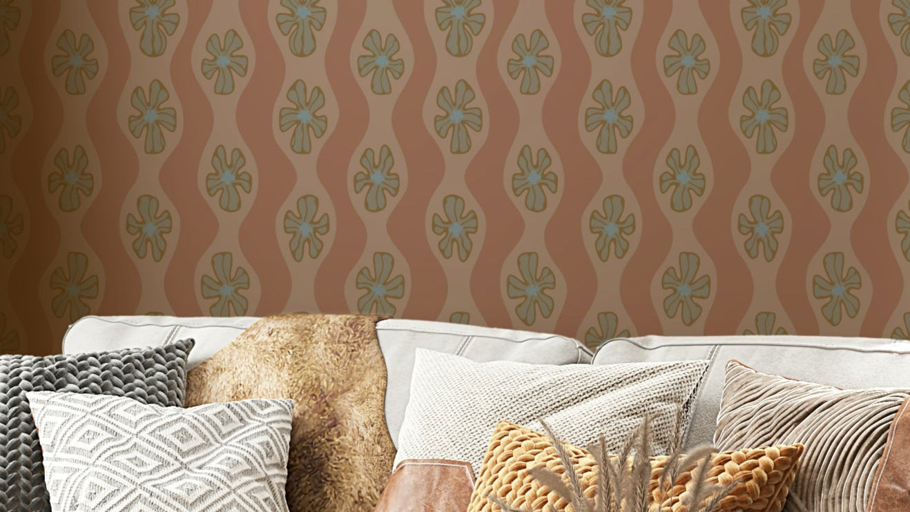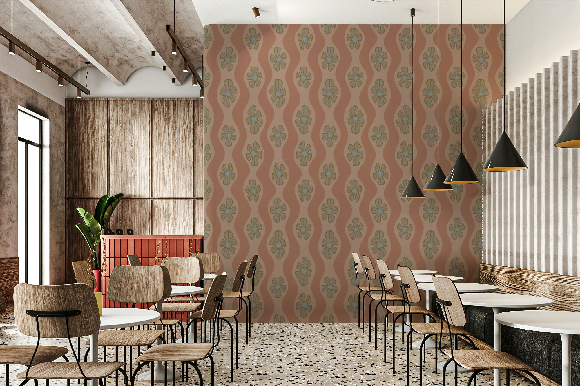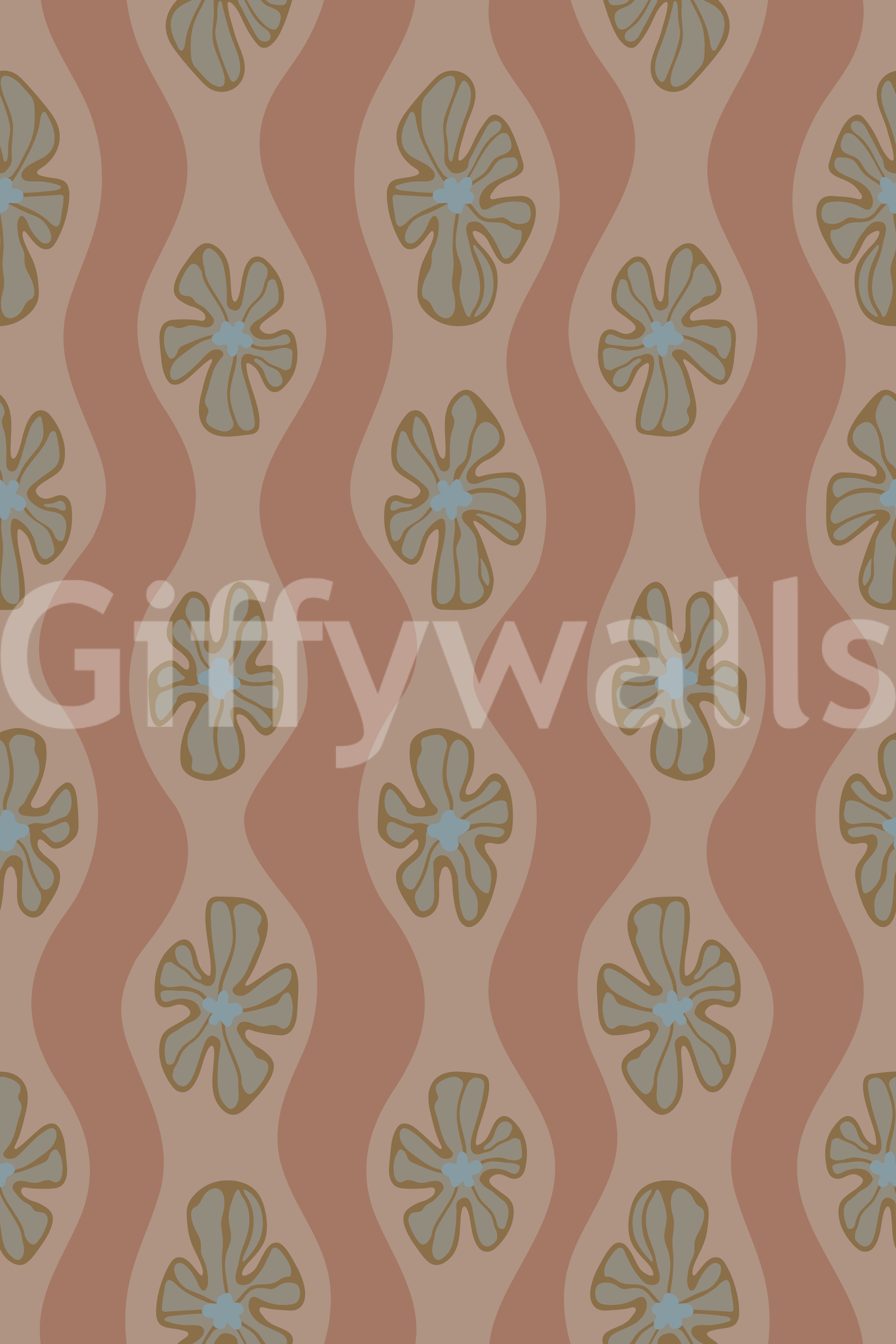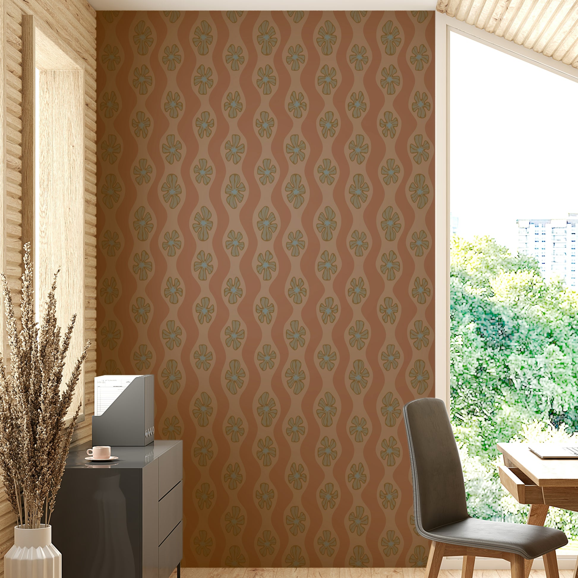 Dive into the warm embrace of this retro floral with wavy stripes wallpaper. This wallpaper marries Mid Century Modern style with a Mocha Mousse earth tone palette, creating a soothing yet stylish backdrop. Wavy stripes elegantly ripple through the design, interspersed with stylized retro floral motifs in neutral tones, each flower boasting a delicate hint of sky blue. The overall effect is reminiscent of vintage textiles, bringing a touch of nostalgic charm and understated sophistication to any space. Perfect for those seeking a retro-inspired, calming and warming wallpaper. This pattern design is also available in Other Colourways too! Original wallpaper pattern design by Jackie Tahara of UnBlink Studio.
