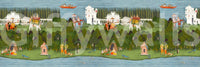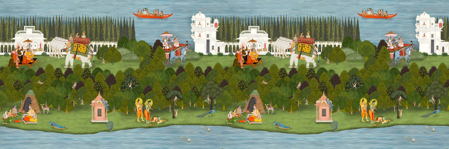 Transport yourself to a serene and timeless landscape with our 'Rishikesh Retreat' wall décor. This meticulously crafted artwork evokes the spiritual essence of India, capturing a scene of regal processions and tranquil riverside life. Imagine the grandeur of ornate white palaces standing as silent witnesses to vibrant scenes below. Witness the majestic elephants adorned in vibrant textiles and the gentle ripple of the clear water. The artwork unveils vignettes of figures in traditional garb, sharing stories in idyllic clearings, framed by lush greenery and playful wildlife. Allow the intricate details and vibrant colours of this piece to infuse your space with a sense of peace, wonder, and the rich heritage of Rishikesh. Elevate your interior with this captivating panorama, transforming any room into a sanctuary of culture and tranquillity.