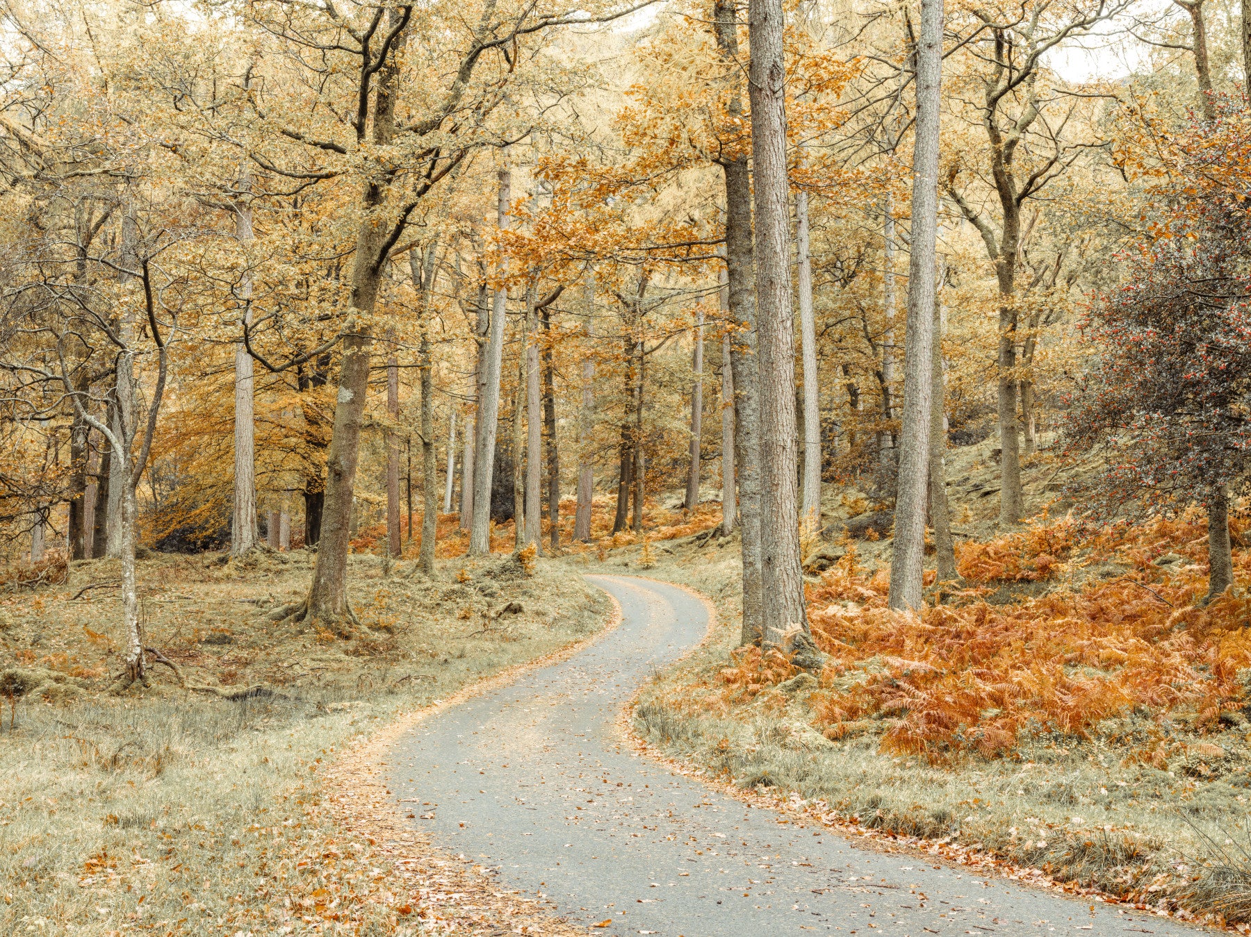 The Road Through Forest Wall Mural captures the peaceful beauty of a winding road surrounded by tall trees with leaves transitioning to autumn hues. The warm oranges, yellows, and greens create a soothing atmosphere, making it perfect for living rooms, bedrooms, or even entryways. The soft natural tones and inviting path suggest a quiet journey through nature, bringing tranquility and a touch of the outdoors into your home. This mural is ideal for those who love the beauty of the changing seasons and want to create a cozy, nature-inspired space.