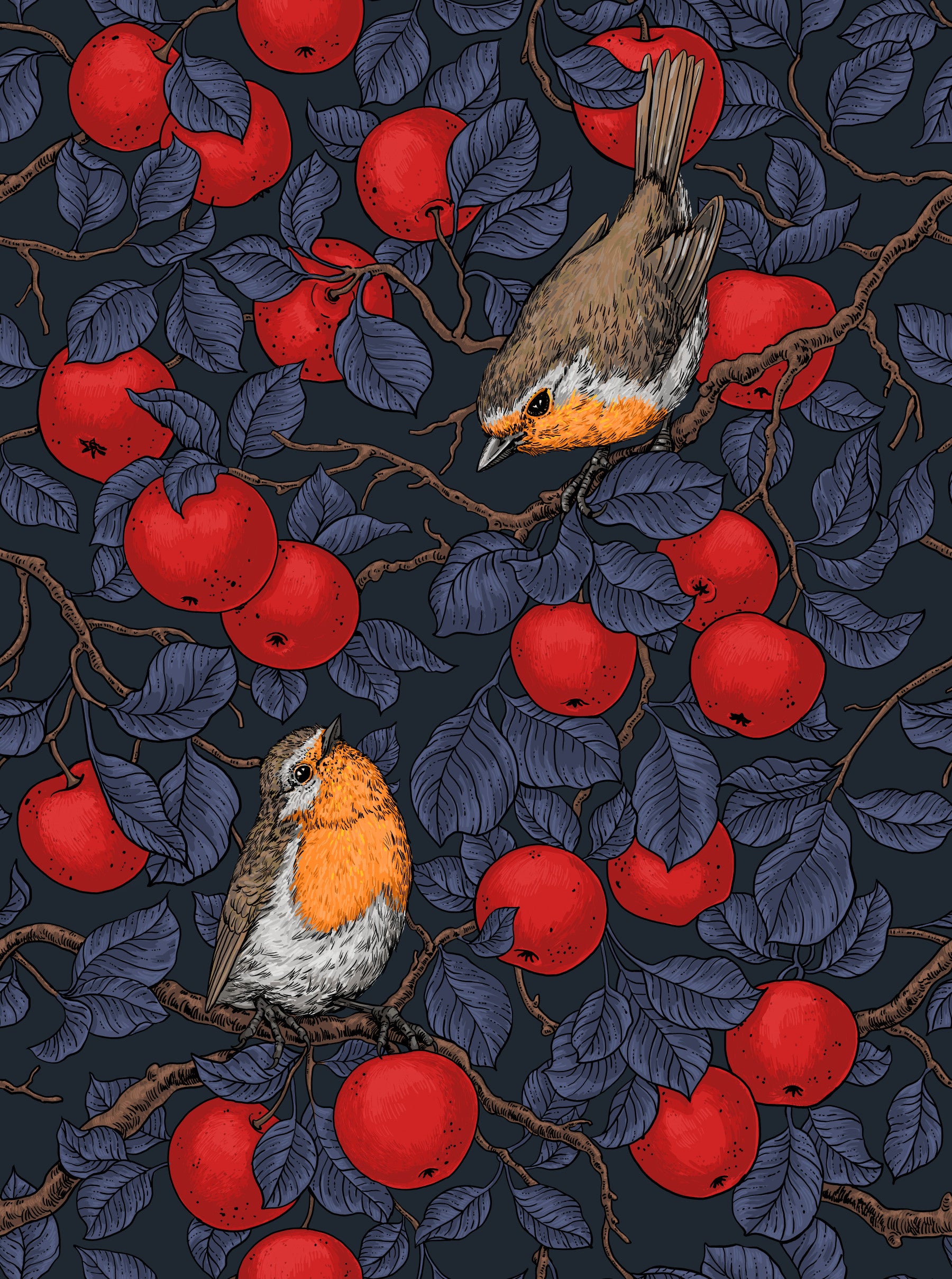 Hand-drawn robin birds perching in an apple tree.