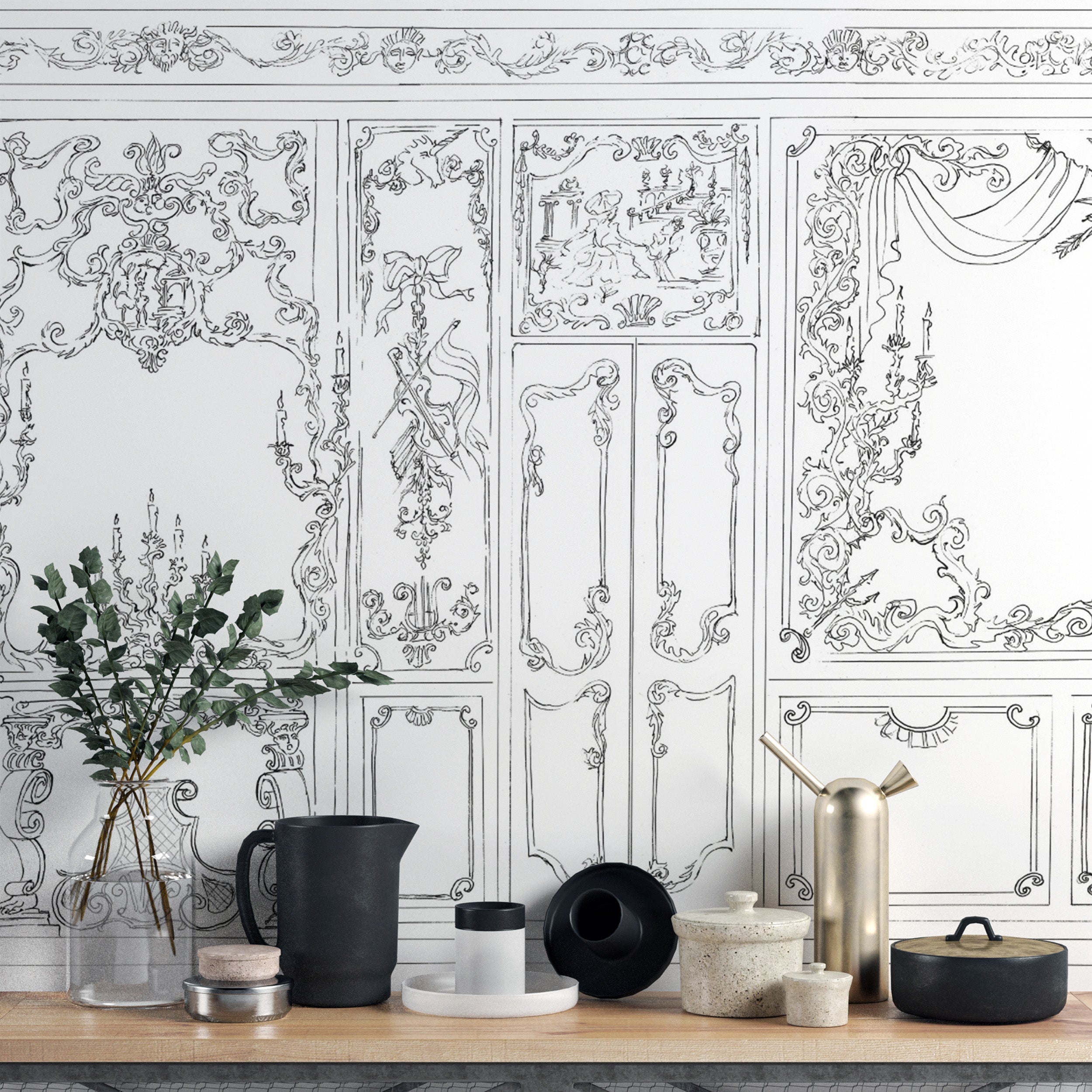 Elegant Rococo wall paneling wallpaper with vintage charm