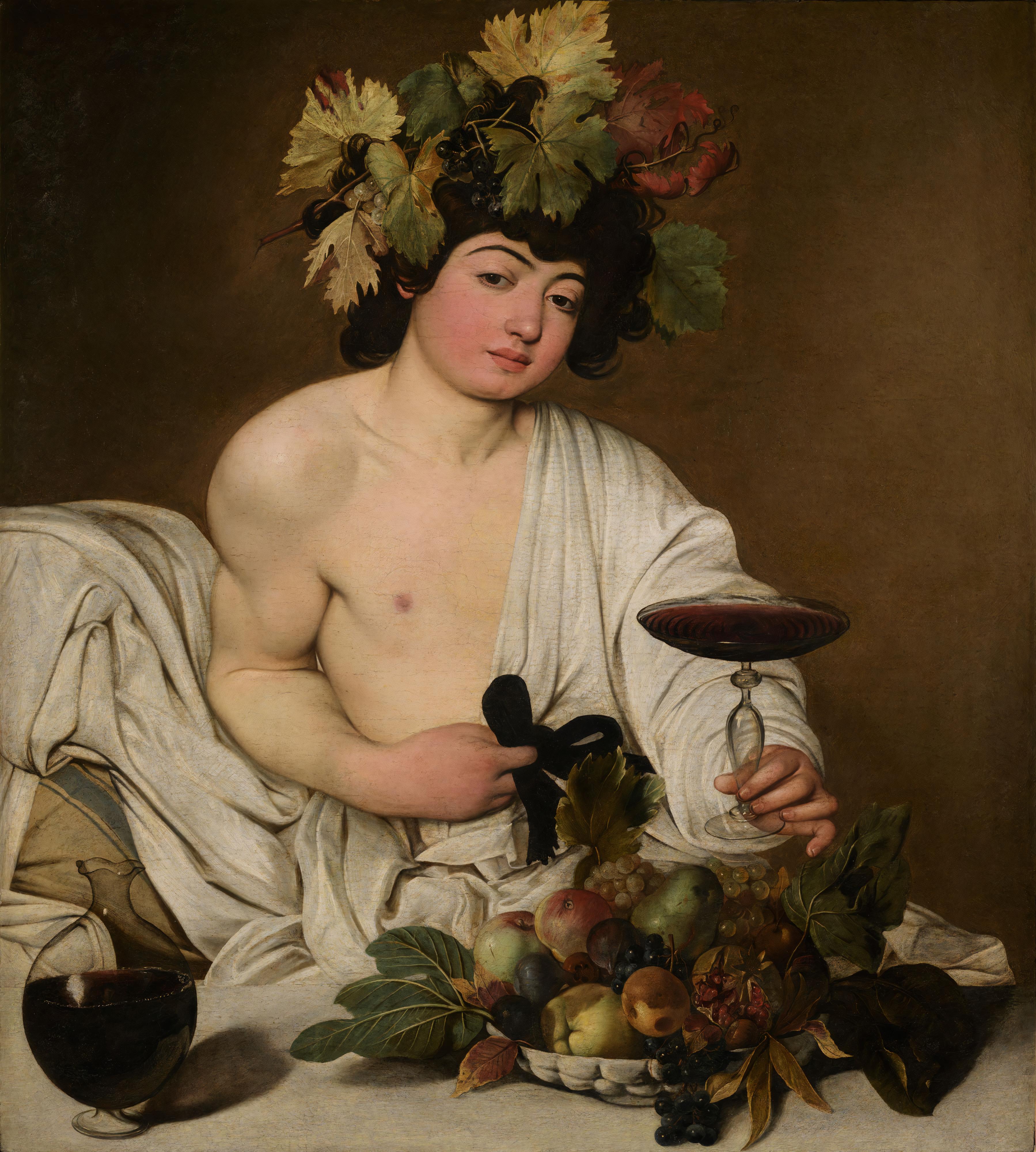 Roman God of Wine artwork inspired by Caravaggio's Baroque style.